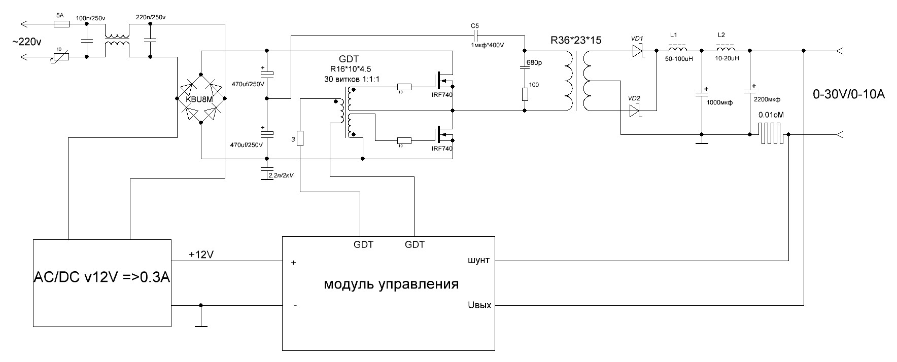 Güç kaynağı, bir itme-çekme yarım aks şemasına göre monte edilir. Buradaki makaledeki şema esas alınmıştır. Kontrol modülü, güç kaynağı ve çıkış transformatörü için PCB'de küçük değişiklikler yapıldı.