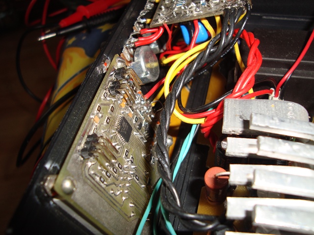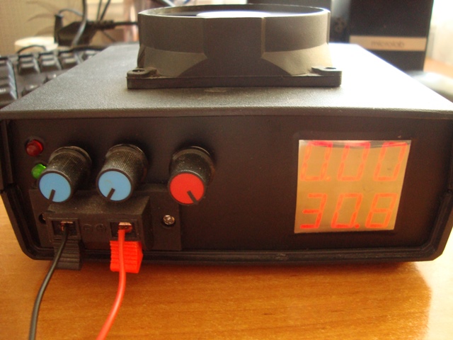 Fotoğrafta, süper yapıştırıcı ile plastiğe güvenli bir şekilde yapıştırılmış somunlara vidalanmış cıvatalarla panele tutturulmuş, mikro denetleyicili bir baskılı devre kartı var - bir ampermetre ve bir voltmetre. Bu göstergenin 9,99 A'ya kadar akım ölçüm sınırlaması vardır ve bu, bu güç kaynağı için açıkça yeterli değildir. Gösterge fonksiyonları dışında akım ve gerilim ölçüm modülü, cihazın ana kartına göre hiçbir şekilde yer almamaktadır. Herhangi bir yedek ölçüm modülü işlevsel olarak uygundur.