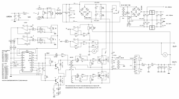 Gerilimi ve akımı kontrol etmek ve TL494 yongasını çalıştırmak için 310 volttan daha düşük bir gerilime ihtiyaç vardır, dolayısıyla bunun için ayrı bir güç devresi kullanılır. Küçük boyutlu bir transformatör Tr3 BV EI 382 1189 üzerine inşa edilmiştir. İkincil sargıdan voltaj, bir kapasitör tarafından basit ve öfkeli bir şekilde düzeltilir ve yumuşatılır. Böylece güç kaynağı devresinin kontrol kısmı için gerekli 12 voltu elde ediyoruz. Daha sonra, 7805 doğrusal stabilizatör çipi kullanılarak 12 volt, 5 volta stabilize edilir - bu voltaj, voltaj ve akım gösterge devresi için kullanılır. Gerilim ve akım gösterge devresinin işlemsel yükselticisine güç vermek için yapay olarak -5 voltluk bir gerilim de yaratılır. Prensip olarak, belirli bir güç kaynağı için mevcut herhangi bir voltmetre ve ampermetre devresini kullanabilirsiniz ve gerek yoksa bu voltaj stabilizasyon aşaması ortadan kaldırılabilir. Kural olarak, yaklaşık 3,3 - 5 volt güç kaynağı gerektiren mikrodenetleyiciler üzerine kurulu ölçüm ve gösterge devreleri kullanılır. Ampermetre ve voltmetrenin bağlantısı şemada gösterilmiştir.