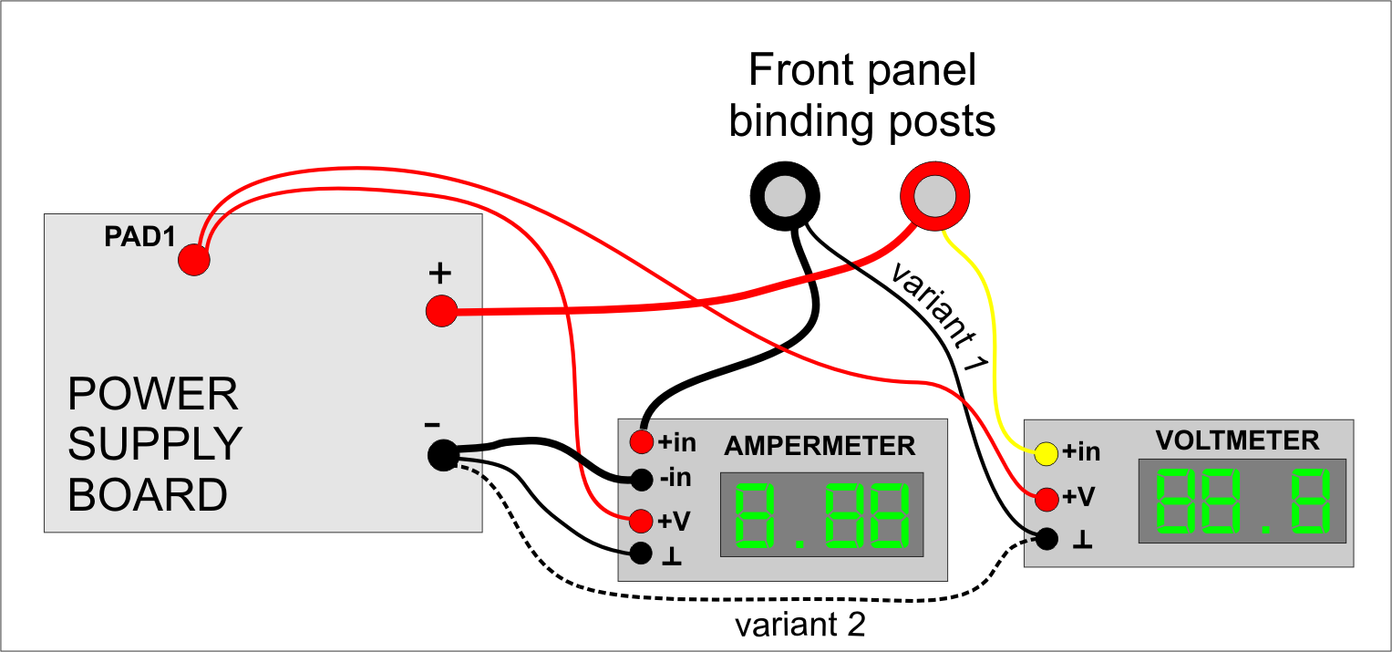 In "variant 2" the ground cable of the voltmeter is connected to the negative output of the board instead of the negative binding post. So his supply current will not be measured, but the voltmeter will display a little higher voltage because the drop voltage at the ammeter (50-80 mV max) will be added.