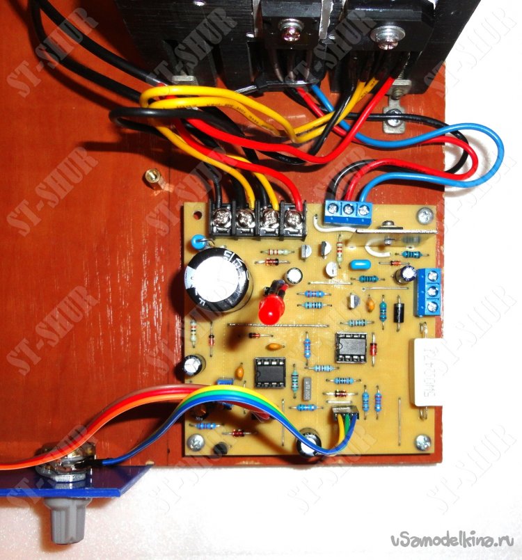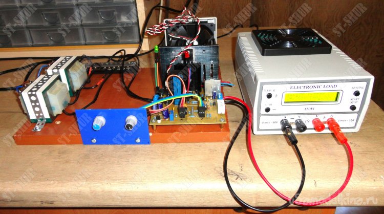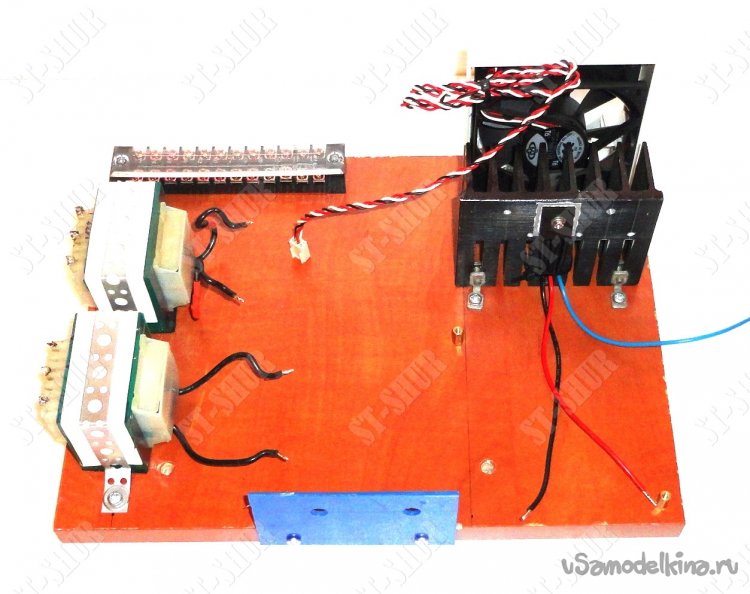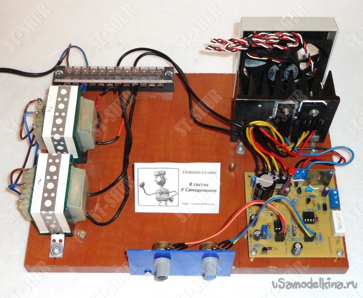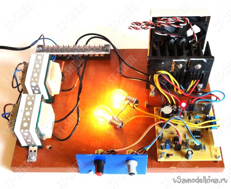 Masadaki “çalışma karmaşasından” kurtulmak için, sunta kesiminde bir tür stand hızla “birbirine çarptı”. Üzerine sabitlendi: mevcut transformatörler, radyatör, fan, terminal bloğu ve değişken dirençler için bir tutucu (gelecekte kullanabilme beklentisiyle).