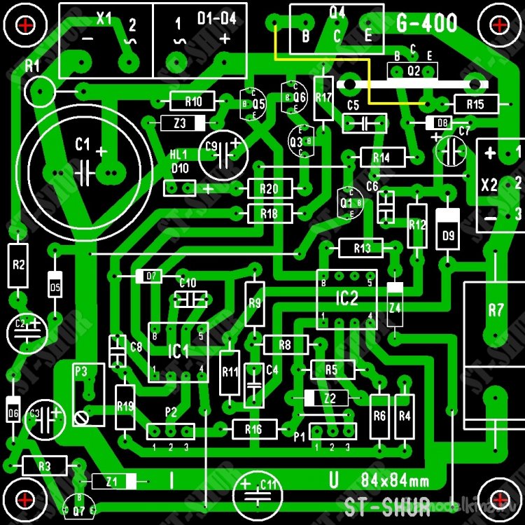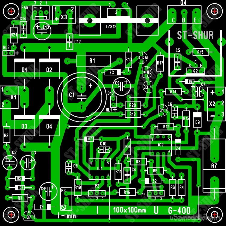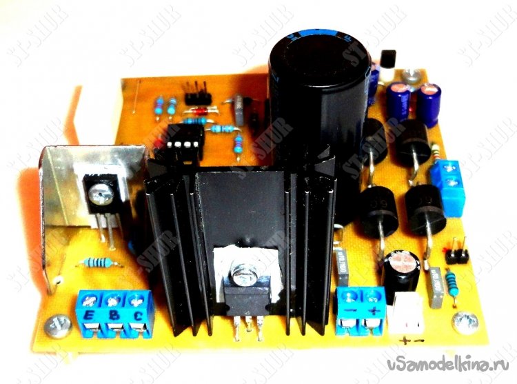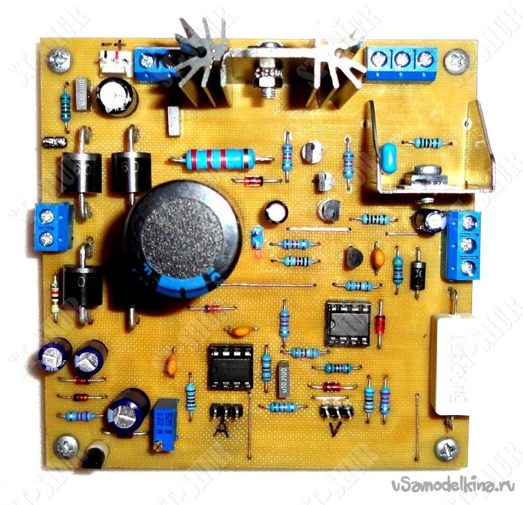 Seçenek No. 1 , orijinal devreye basit bir 12V stabilizatörün eklendiği (fana, amper-voltmetreye ve diğer olası "ilavelere" güç sağlamak için) 100x100mm boyutunda fiberglas üzerine monte edilmiştir. Daha güçlü doğrultucu diyotlar (6A'da) ve daha büyük bir kapasitör C1 (50V'de 6800uF) da kurulur. Kartın bu versiyonu, çıkış transistör Q4'ün teller kullanılarak bağlanmasını sağlar.