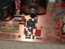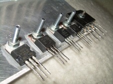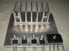 A beültetést -mint általában mindig- az átkötésekkel kezdjük. Amennyiben alkatrészoldali teliföldet használtunk, akkor az átkötéseknek szigetelt vezetékből kell készülniük! Az átkötések után az alacsonyabb, majd a magasabb alkatrészekkel folytassuk a beültetést. Fontos megjegyezni, hogy a vízszintes panelon C11 és C25 elkók lábait szét kell hajlítanunk a beültetéskor. Ha teliföldet használunk, akkor a lábaik valószínűleg hozzáérnének a teliföldhöz, ezért egy kis szigetelőszalag-darabot kell ragasztanunk a két elkó lábai között lévő rézre! A 4db potméter lábai a képen látható módon szinte biztosan hozzáérnek a teliföldhöz, ezért alájuk is 1-1 kisebb méretű szigetelőszalag darabot kell ragasztanunk. A potmétereknek mindenképpen a képen is látható "ALPHA" típusúaknak kell lenniük, mert a panelok ehhez vannak tervezve. Viszont ezeken a potmétereken a menetes rész mellett balra van egy kis fém kiálló rész, amit egy csípőfogóval le kell törnünk, különben a függőleges panelt nem tudjuk derékszögbe állítani. A két kapcsoló beforrasztásánál vigyázzunk hogy minél kevésbé melegítsük fel a kapcsolókat, mert ezeknek a kapcsolóknak a kivezetései hajlamosak nagyon könnyen kiolvadni. A 10000uF-os kondenzátor (C9) alatt van C11. Ez a kondenzátor legyen minél vékonyabb típus, hogy a nagy puffer elkó alá beférjen. Én egy vékony kis kerámiát használtam, de akár a fóliaoldalról is beforraszthatjuk a C11-et. Az összes alkatrész beforrasztása után erősen ajánlott lesípolni hogy biztosan nincs-e zárlat valamelyik láb és a teliföld közt! Ez után a vízszintes panel megvastagított, nagy áramot vivő fóliáit forrasszuk át, nem sajnálva az ónt! Ha ezekkel megvagyunk, akkor a két panel forrasztási oldalait alaposan mossuk le denaturált szesszel (mindig ezt mondom, de én magam aromás higítót használok), hogy a forrasztáskor a panelra olvadt gyantát eltávolítsuk. Ha ezt nem tesszük meg, akkor a panelmérő biztosan nem fog helyesen működni. Ez után öblítsük le a panelokat és hagyjuk megszáradni. Ha megszáradtak, akkor a két panelt illesszük össze és a találkozási élükön lévő fóliaszigeteket forrasszuk össze. A vízszintes panel hátsó élénél lévő alkatrészeket hűtőbordára kell szerelni. Ehhez egy 11cm széles és 10cm magas (nálam 4mm vastag) alumínium lapra és egy hűtőbordára lesz szükségünk azért, hogy a bordák a függőleges panel felé álljanak, helyet hagyva így a doboz hátulján lévő trafónak. Az alkatrészek rögzítő furatainak helyeit jelöljük be az alumínium lapon majd fúrjuk ki. A laphoz rögzítendő hűtőbordát én az Elektrokonthában vettem és félbe fűrészeltem mert túl hosszú. Az alumínium lap és a hűtőborda összecsavarozásához is szükségünk van két furatra a lap felső részén. A furatok elkészítése után csillám, hővezető paszta és szigetelő gyűrű alkalmazása mellett csavarozzuk fel az alkatrészeket az alumínium lapra, majd rögzítsük a laphoz a hűtőbordát is, nem sajnálva a hővezető pasztát. A graeztnél természetesen nem kell csillám és szigetelő gyűrű. Viszont a graetz tokján van egy kis kitüremkedés, ami miatt egy picit meg kell hajtanunk a lábait hogy a bordához feküdjön. A kitüremkedés miatt keletkezett kis rést a hővezető paszta majd kitölti. (A graetz-et nem a tokozás adta irányban terveztem rá a panelra, egyéb okok miatt.) Ha ezzel megvagyunk, akkor a kész hűtőfelületet a rá szerelt alkatrészekkel forrasszuk be a panelba.