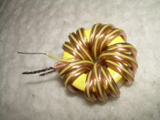 L2, R31 és C38 a kimeneti szűrőt alkotják. L2 nagyáramú tekercse a kimeneten lévő zaj számára nagy értékű impedanciát képvisel, azért a nagyfrekvenciás áram R31 ellenálláson folyik át, ami így leosztja azt. DC szempontból a tekercs rövidzár, emiatt az egyenáramú (hasznos) összetevő akadály nélkül jut tovább a kimenet felé. C38 váltakozó áramú szempontból rövidzár. Szűrésre azért van szükség, hogy a tápegység kimeneti zaját, amit az előszabályozó termel lecsökkentsük. Ha egy egyszerű induktivitást használnánk (ezt is lehet), akkor mivel a négyvezetékes kimenet a szűrő után van, a szabályozás már csak a szűrt kimeneti jelet 'látná' és kevésbé igyekezne az azon még meglévő zajt kiszabályozni. Ezért L2 egy transzformátor, aminek a megtekerésének módja miatt a szabályozókör 'visszanyeri' a káros tranzienseket. L2 elkészítése: Szinte bármilyen gyűrűre (én PC-tápokban lévő sárga gyűrűt használtam) tekerjünk fel két vezetéket. Az egyik vezetéknek olyannak kell lennie ami elbírja a táp névleges maximális áramát, a másiknak elég csak egy vékony, akár zománcozott szigetelésű vezeték is. A két vezetéket a gyűrűre szigorúan menet-menet mellé kell feltekerni, azonos menetszámmal! A menetszám nem lényeges, annyit tekerjünk a gyűrűre, amennyi csak ráfér. Én egy két eres hangszóró-vezetéket és egy vékony egy eres vezetéket használtam. Először feltekertem a hangszóró-vezetéket, aztán a vékony drótot a hangszóró-vezeték két ere közt lévő kis vájatba tekertem végig. A hangszóró-vezeték két erét a végén persze összesodortam és úgy ültettem a panelba.