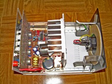 Az M20-as műszerdobozt csavarozzuk szét, és a két lyukacsos idom elölről a 2. és a 9. lyukaihoz csavarozzuk hozzá a négy (1-1db) 8mm-es belső-belső menetes távtartót, az idom alulsó részénél 1-1db alátétet alkalmazva. Fontos, hogy minél rövidebb csavarokat használjunk, mivel maga a távtartó is csupán 8mm hosszú és még a panel felől is bele kell majd csavarnunk 1-1 csavart. A hálózati védőföld csatlakoztatásához még egy csavart csavarozzunk az egyik idom leghátsó. Erre majd később lesz szükségünk. Ez után csavarozzuk össze a két idomot a doboz aljával. A toroid transzformátort én Kléh Györggyel tekertettem, elérhetőségét e-mailben megadom. A toroiddal kapcsolatban fontos, hogy maximum 11cm átmérőjű és 8cm magas lehet, máskülönben nem fér be a dobozba az áramkör mellé. Tekertethetünk máshol is, csak a trafó geometriai méretei nagyon fontosak. Megbízhatóbb céget biztosan találunk, de olcsóbbat nem nagyon. (Nekem Kléh már szó szerint a csillagokat is leigérte az égről, hogy készen lesz szerdára a toroidom, de csak a következő hétre lett kész nagy nehezen...) A doboz hátsó lapját fektessük le és helyezzük rá a toroid transzformátort, majd jelöljük be a toroid gyűrűnek a belső körét a hátlapon és ennek megfelelően készítsük el a hálózati csatlakozó helyét. Ez után a trafót helyezzük rá a hátlapra és a méreteket lemérve vastag alumínium csíkokból hajlítsuk meg a transzformátort rögzítő idomokat, majd ezeket nagyon erős (két komponensű) ragasztóval ragasszuk a hátlaphoz. Fontos, hogy jó helyre ragasszuk ezeket az idomokat, mert különben nem tudjuk majd a hátlapot a dobozhoz csavarozni (KÉP!). Javaslom hogy a ragasztó úgy kössön meg, hogy közben a trafó már a helyén van, így biztosan jó helyre ragasszuk a tartó idomokat. Én gumi csíkokat is ragasztottam a tartókra, hogy nehogy felsértsék a trafó szigetelését. Amíg a ragasztó szárad, addig elvégezhetjük a hálózati csatlakozó összedrótozását, illetve még a trafó primerjének kivezetésére sarukat kell szerelnünk. Itt nagyon ajánlott zsugorcső használata. A furatsorba korábban becsavart csavarhoz rögzítsünk egy zöld-sárga vezetékdarabot, aminek a másik végére sarut forrasztunk és a hálózati csatlakozó földelés-kivezetéséhez csatlakoztatunk. Valami gyűrű alakú vastagabb anyagot (pl. PVC-t) ragasszunk a trafó alá a hátlaphoz.