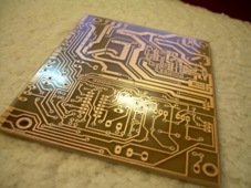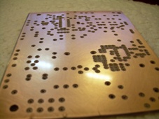 A vízszintes panel elkészítéséhez egy 135mmX100mm-es nyáklapra, a függőleges panelhoz pedig egy 135mmX106,5mm-es nyáklapra lesz szükségünk. Mindkét nyáklap egyoldalas, de javasolt kétoldalas nyáklap használata és az alkatrészoldalon teliföld kialakítása. Ennek inkább a vízszintes panelnél van jelentőssége. Az alkatrészoldali teliföld esetén egy csomó plusz munkánk lesz az elkészítésnél, viszont cserébe egy jobb áramkört kapunk. A panelterveket a méretre vágott és megtisztított nyáklapokra vasaljuk rá (vagy fotózzuk). Abban az esetben ha teliföldet használunk, akkor a panel másik oldalát meg kell védenünk a savtól. Ezt legegyszerűbben szigetelőszalag-csíkok ráragasztásával érhetjük el. A celluxot nem ajánlom, mert azt könnyen leáztatja a sav. Fontos, hogy a vízszintes panel elülső élénél (ahova majd a függőleges panel csatlakozik) a nyáklap szélén egy 1-2mm-es csíkot szándékosan hagyjunk ki és ne ragasszunk oda szigetelő szalagot azért, hogy a sav azt a kis részt lemarja. Erre azért van szükség, hogy a teliföld ne érintkezzen véletlen se a függőleges panelon a vízszintes panel síkjában futó vezetősávokkal. Még a maratás előtt ellenőrizzük, hogy nem-e lett hibás a vasalás. Ha szakadással vagy zárlattal találkozunk akkor azt filccel vagy kaparással javítsuk ki. Zárlatra leginkább az IC-k lábai közt elvezetett fóliáknál van nagy esély. Lábak közé csak a függőleges panelon terveztem vezetősávokat, ezért a vasalásból eredő zárlatra inkább itt kell számítani. Ezek után marjuk ki a panelokat, majd alapos öblítés után távolítsuk el az alkatrészoldali teliföldet védő réteget (amennyiben teliföldet használunk). A tinta lemosása után készítsük el a furatokat, ügyelve az alkatrészek lábainak vastagságára! Javaslom, hogy először minden furatot 0,7-es (vagy 0,8-as) csigafúróval fúrjunk ki, majd sorban egyre nagyobb fúrókkal a vastagabb lábú alkatrészek furatait. A legvastagabb furatok a távtartóknak, a biztosíték-foglalatoknak, az induktivitásoknak, a két kapcsolónak és a graetz-nek kellenek. A függőleges panelon a potméterek tengelyének furatait és a kimeneti banándugós csatlakozók helyeit ki kell marni. Én ezt egyszerűen egy 3-as csigafúróval magas fordulaton szoktam elvégezni. Ha alkatrészoldalon teliföldet használunk, akkor az alkatrészoldali rézfelületen a furatok körül lévő rezet le kell marnunk, különben a beültetendő alkatrészek lábai egy nagy rövidzárhoz csatlakoznának. Én ezt egy egyedi készítésű szerszámmal oldottam meg: egy 3-as fafúró hegyének két oldalát vízszintesre köszörültettem, így megmaradt a hegy közepén lévő csúcs, ami megvezeti a csigafúrót és a két oldalt síkba köszörült rész pedig lemarja a furatok körül lévő rezet. Ennek a használatakor óvatosan dolgozzunk, hogy ne nagyon marjunk bele a nyáklap szigetelő (hordozó) részébe! A furatok körüli réz eltávolítása után egy finom csiszolóvászonnal csiszoljuk le az alkatrészoldalt, mert a marás (fúróval történő marás) után kis 'réz-sorják' maradnak, amik zárlatot okozhatnak.