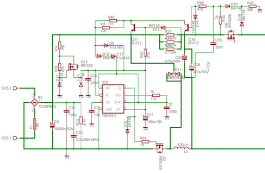 Kontrol, Q7 siyahını süren sinyalin görev döngüsü (ve frekansı) değiştirilerek gerçekleştirilir; Q7'nin açık durumunda akım, C25 ve C26 tampon kapasitörlerini şarj eden R51, R52, R53 ve L1 bileşenlerinden geçer. Voltaj, Q6 geçirgen fet DS'nin yakl. 0,6V, sonra transistör Q10 açılmaya başlayacak ve kollektör akımı kapasitör Ci'yi şarj edecek, ardından IC1 ters dönecek ve fet'i kapatacaktır. Aynısı, akım R51, R52, R53 dirençleri arasındaki voltajın Q11'i açacak kadar artması durumunda da olur. NE555 çıkışı yatırıldığında Q7 kapanır ve çıkış voltajı ve akımı düşmeye başlar. Daha sonra L1 bobininde şimdiye kadar biriken manyetik enerji, D11 diyotu aracılığıyla C25-C26 kapasitörlerine yüklenir. Hem Q10 hem de Q11 kapalıysa, daha sonra Ci kondansatörü Ri üzerinden boşalmaya başlar, bu zaman sabiti Q7 fet'in minimum ne kadar süreyle kapalı kalacağını belirler. Ci'yi boşalttıktan sonra Q7, çıkış voltajına ve akımına bağlı olarak bir süre (gerekli voltaj veya akıma ulaşılana kadar) tekrar açılır.