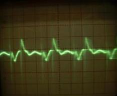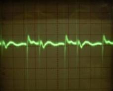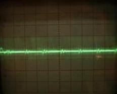 A következő szkópábrák a kimeneti zaj tehelés értékétől függő változásának szemléltetésére készültek. A bal oldali képen lévő jelalak 4db 24V 60W-os izzó terhelése esetén látható, a jobb oldali képen pedig a 2db (sorba kötött) izzó esetén lévő jelalak látszik: