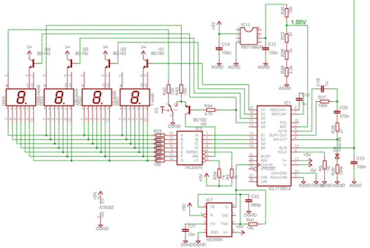 Az ICL7135 multiplexált BCD kimenetén lévő információt a 74LS47-es hétszegmenses kijelződekóder (IC5) alakítja át és működteti a közös anódos LED kijelzőket. A szegmensek áramát R23-R35 ellenállások korlátozzák. Q1-Q4 tranzisztorok kapcsolják az ICL7135 kimenetén éppen lévő értékhez tartozó digitet. Ezen tranzisztorok kollektora egy külön stabilizátorról előállított és huzalozott +5V-ra kapcsolódnak („V+”), hogy a kijelzők áramfelvétele és a multiplexálás frekvenciája semmi esetre sem zavarja meg a labortápegység többi áramköri részének működését.