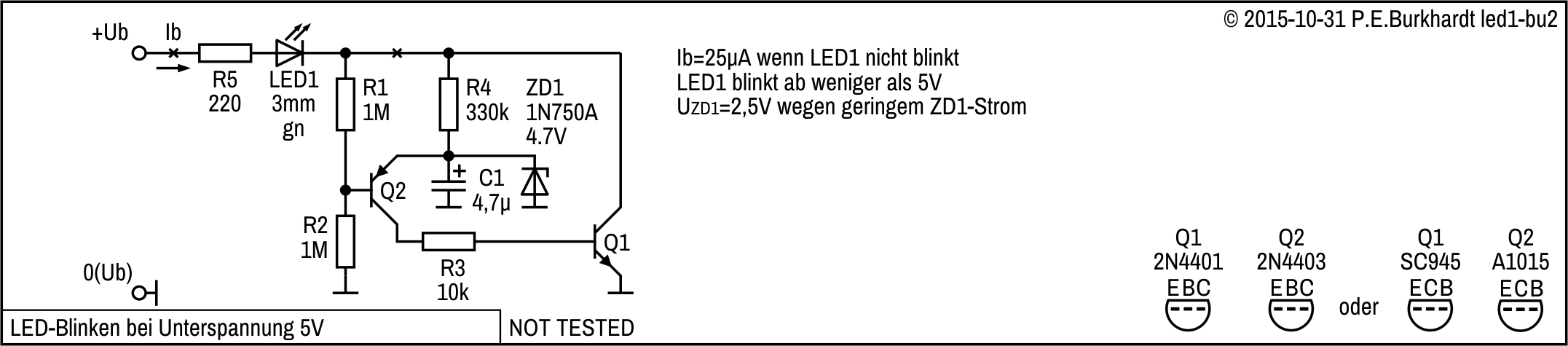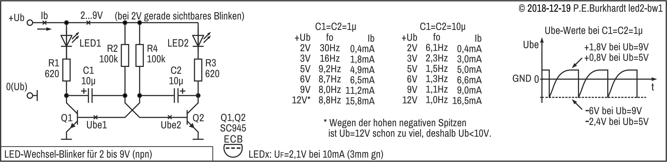LED1 ist eine glasklare runde 3mm-Diode mit niedrigem Leuchtbeginn. Schon bei 40 Mikroampere LED-Strom zeigt sich ein deutlich erkennbarer Leuchtpunkt. Das ist günstig, weil dadurch ein unerwünschter LED-Strom während der LED-Dunkelphase gut erkennbar ist. Die LED sollte im Impulsbetrieb bis zu 200 mA aushalten können, was aber die meisten kleinen LEDs verkraften. Vorsicht ist aber angebracht, wenn beim Test einer Schaltung der AMV nicht schwingt und im leitenden Q2-Zustand verharrt. Die LED wird dann mit Dauerlicht leuchten und relativ schnell überlastet, wenn +Ub hoch genug ist.