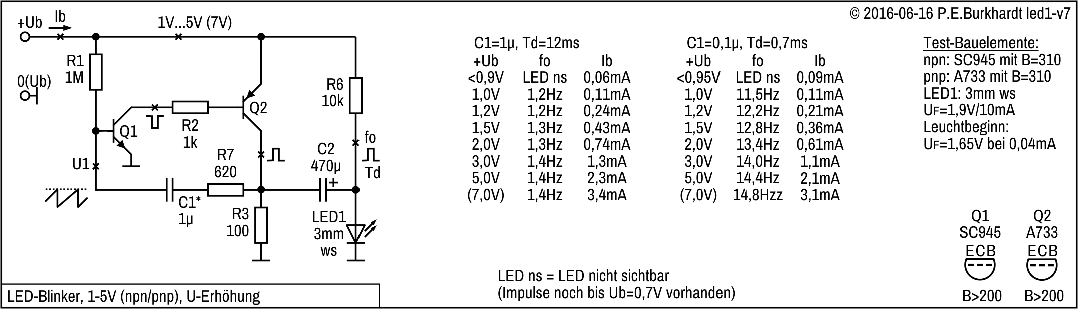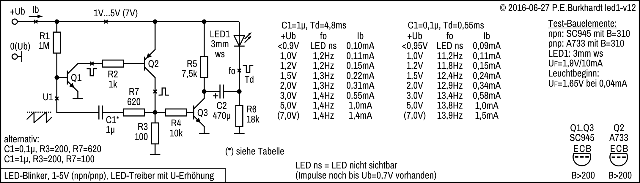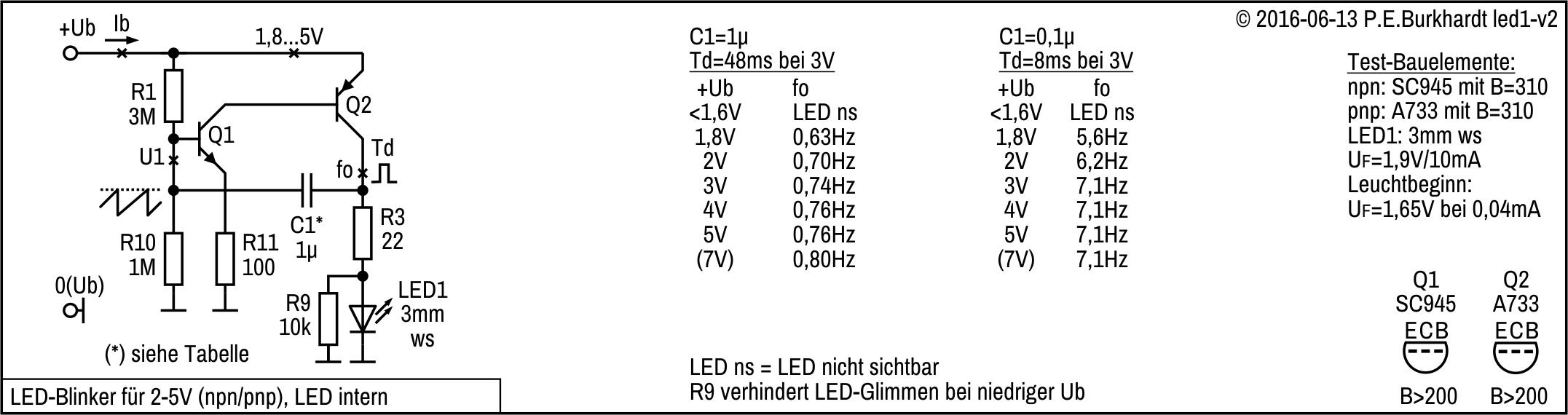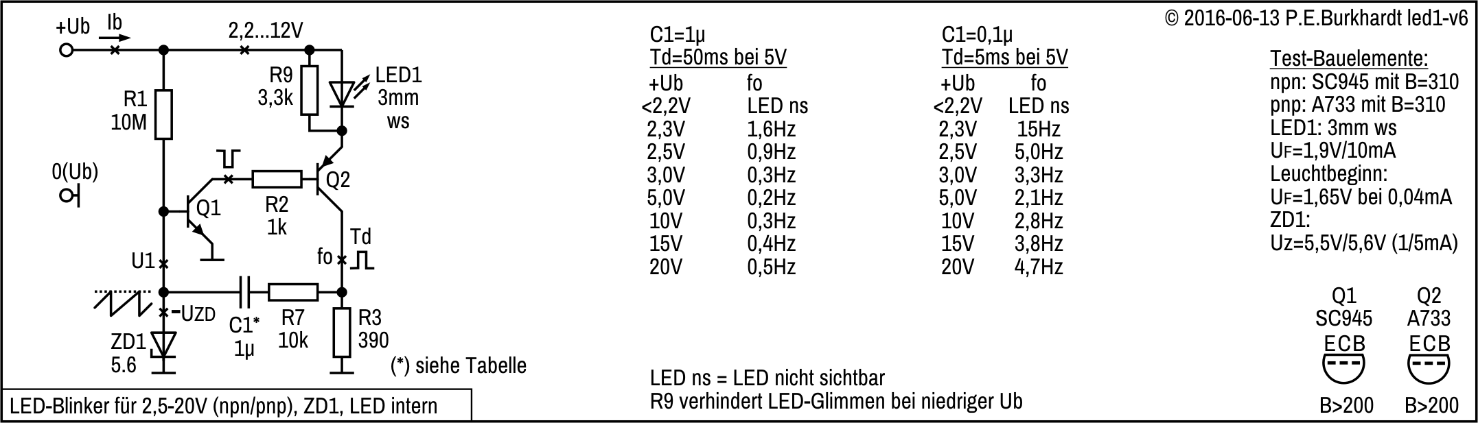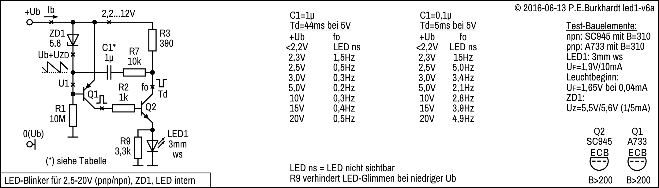 Die folgenden Blinker-Varianten sind alle im jeweils angegebenen Ub-Bereich getestet. Die Blinkfrequenz fo wurde mit einem digitalen Zähler, die Impulsdauer Td mit einem analogen Oszi bestimmt. Die Strom-Messung erfolgte mit einer speziellen Mess-Schaltung, um bei der sehr kleinen Einschaltdauer der Stromaufnahme die Strom-Mittelwerte bei akzeptabler Ablesezeit feststellen zu können.