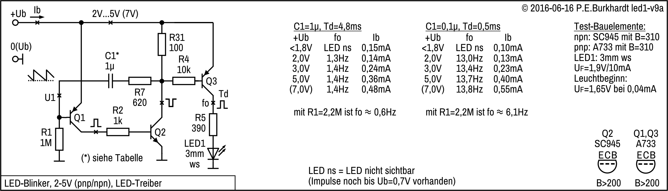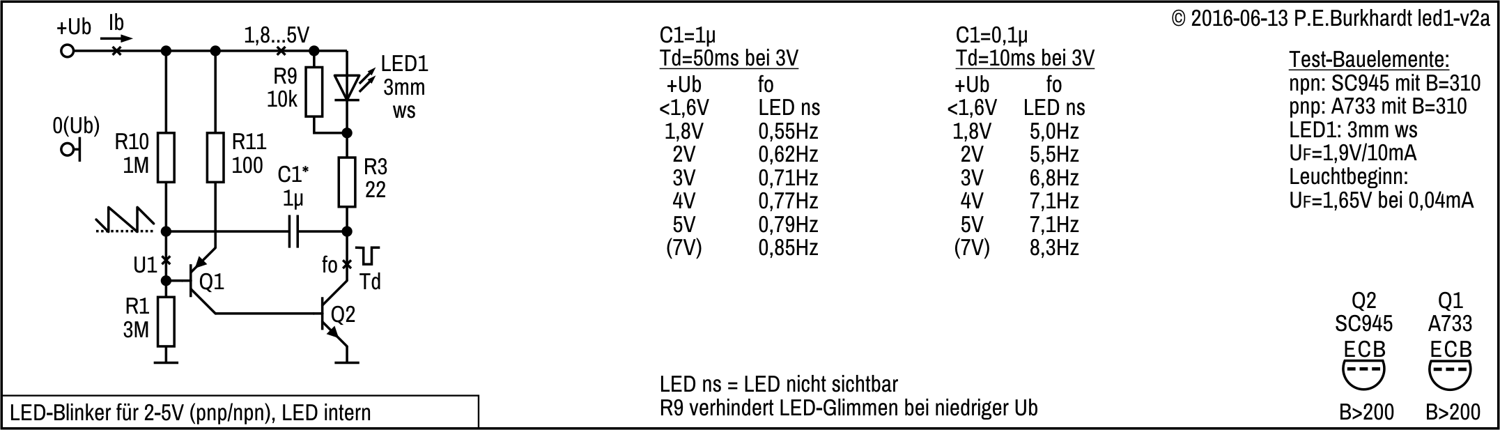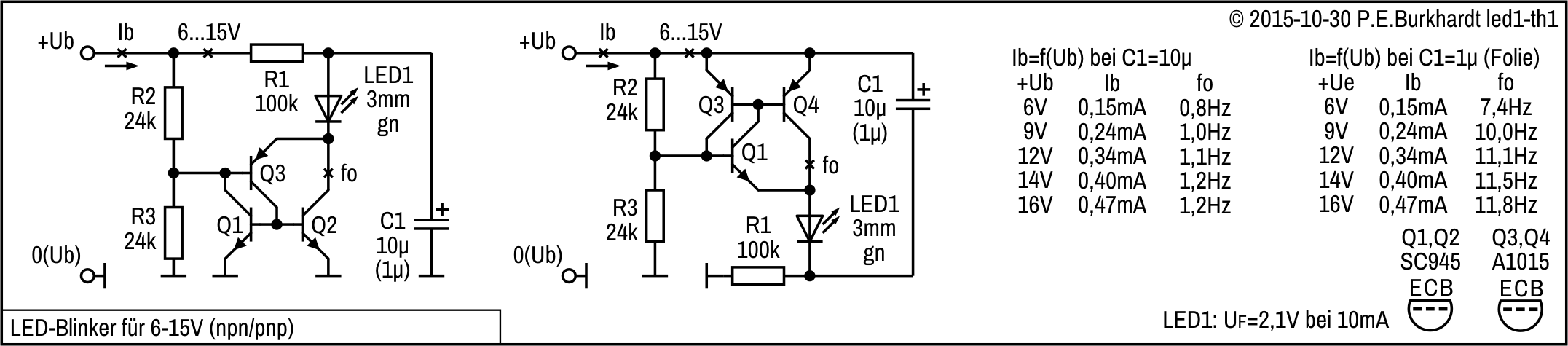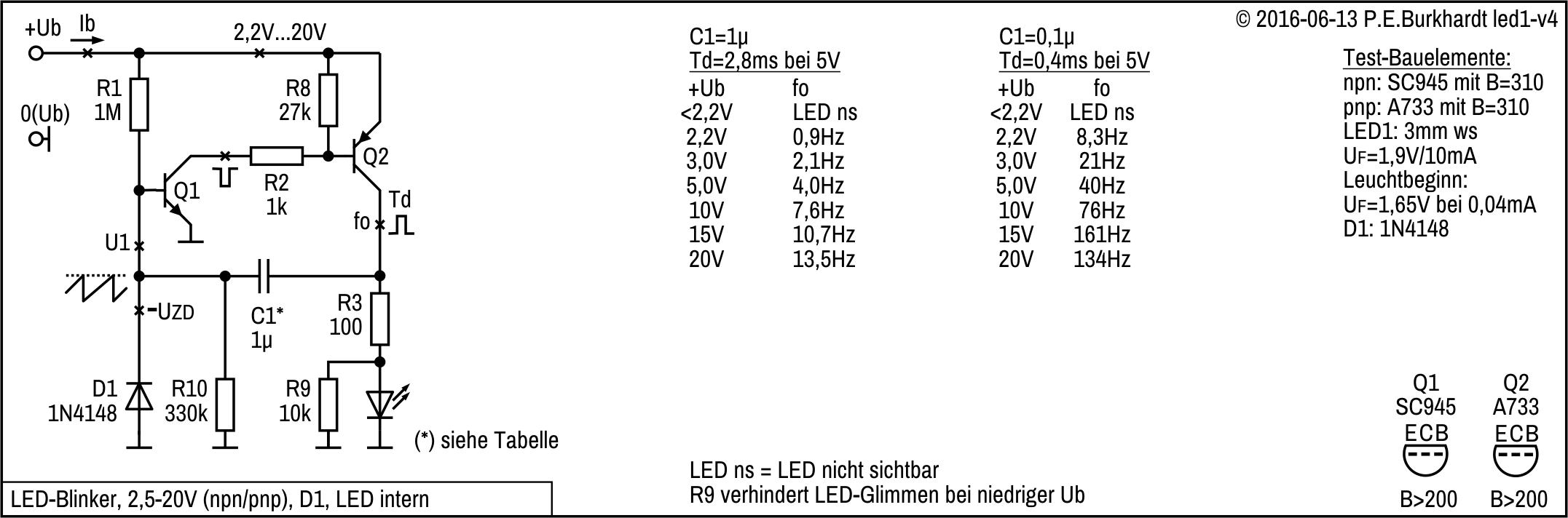 Die folgenden Blinker-Varianten sind alle im jeweils angegebenen Ub-Bereich getestet. Die Blinkfrequenz fo wurde mit einem digitalen Zähler, die Impulsdauer Td mit einem analogen Oszi bestimmt. Die Strom-Messung erfolgte mit einer speziellen Mess-Schaltung, um bei der sehr kleinen Einschaltdauer der Stromaufnahme die Strom-Mittelwerte bei akzeptabler Ablesezeit feststellen zu können.