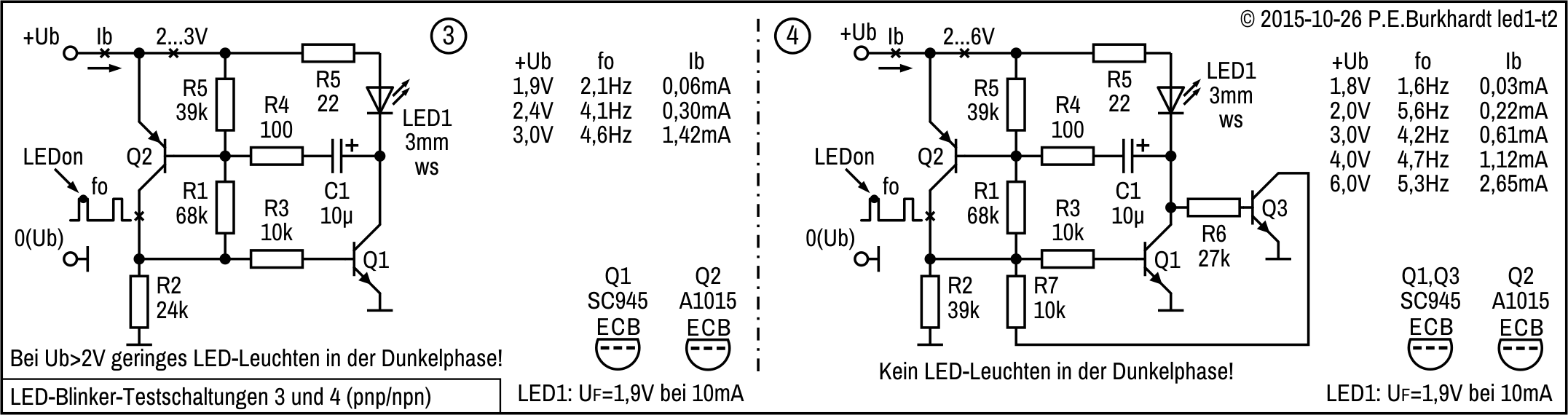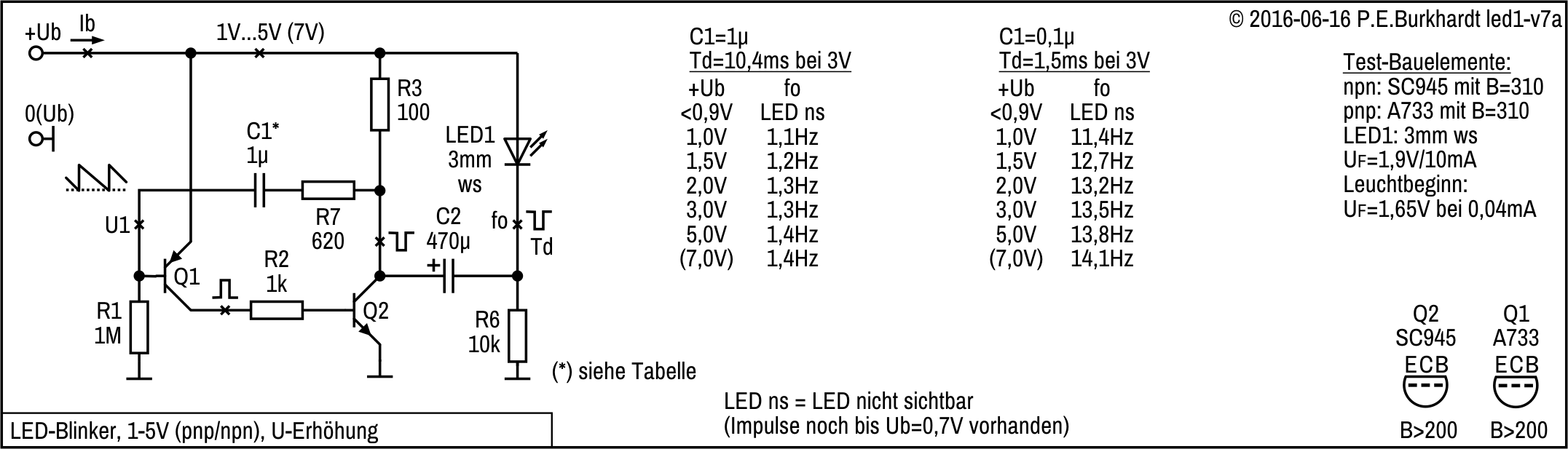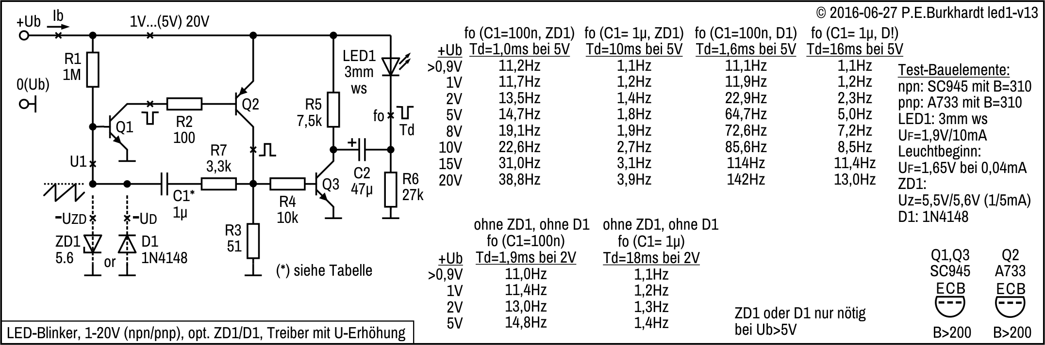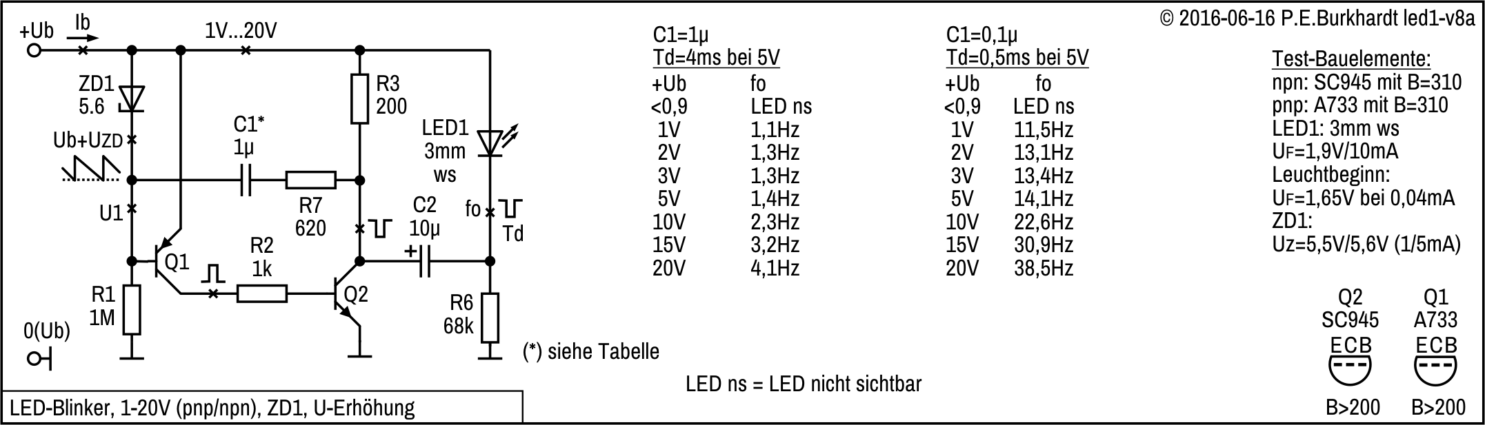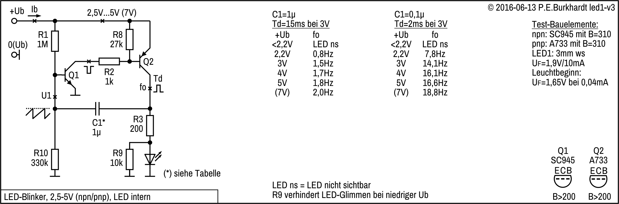 Die folgenden Blinker-Varianten sind alle im jeweils angegebenen Ub-Bereich getestet. Die Blinkfrequenz fo wurde mit einem digitalen Zähler, die Impulsdauer Td mit einem analogen Oszi bestimmt. Die Strom-Messung erfolgte mit einer speziellen Mess-Schaltung, um bei der sehr kleinen Einschaltdauer der Stromaufnahme die Strom-Mittelwerte bei akzeptabler Ablesezeit feststellen zu können.