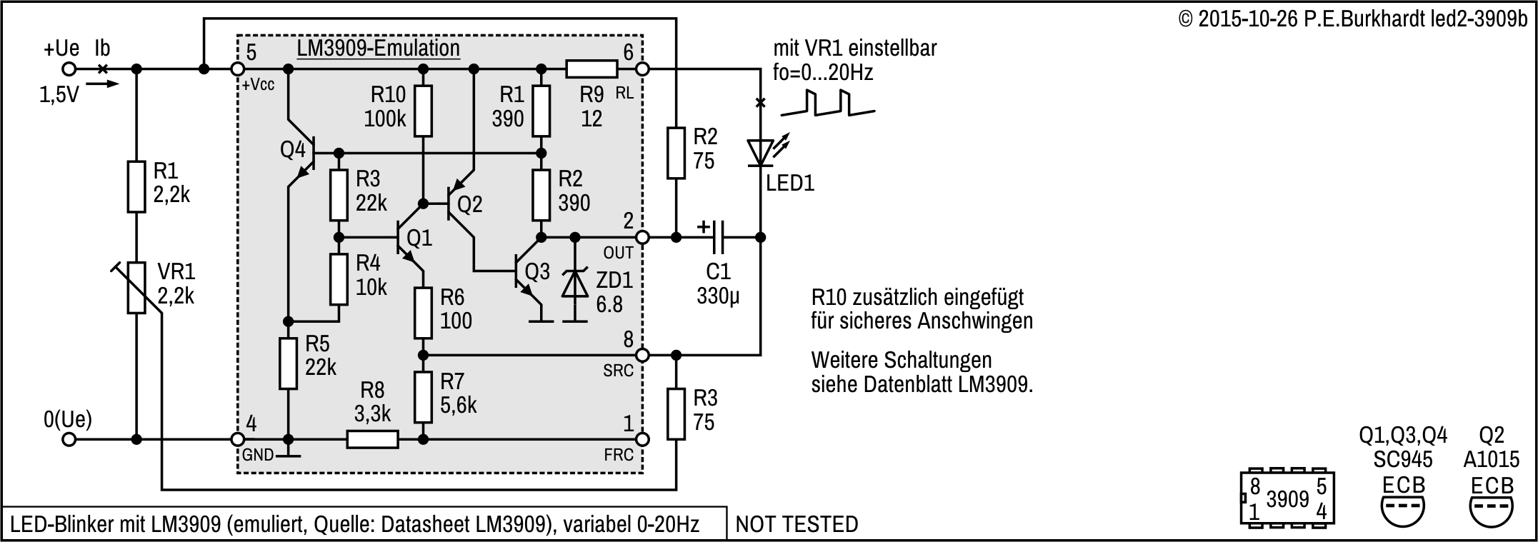 Auch die folgende Schaltung mit einstellbarer Frequenz ist in ähnlicher Form im 3909-Datenblatt zu finden. Darüber hinaus gibt es dort weitere typische Anwendungsbeispiele, die sich mit der hier gezeigten IC-Nachbildung realisieren lassen.