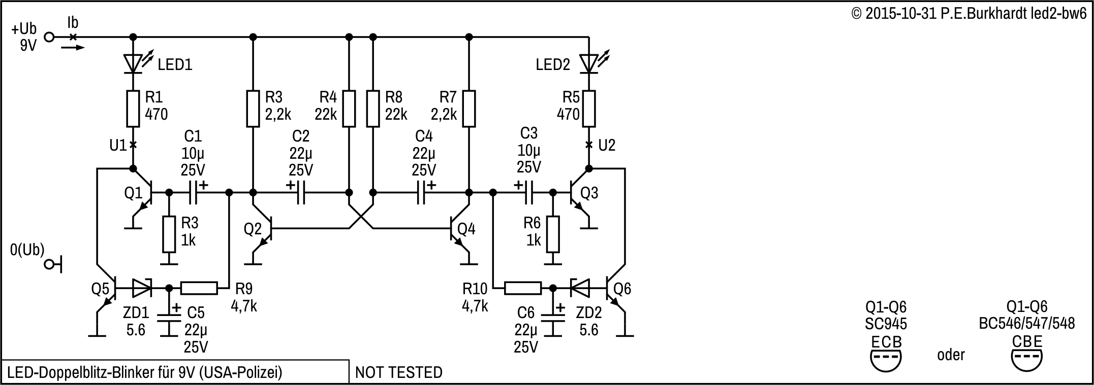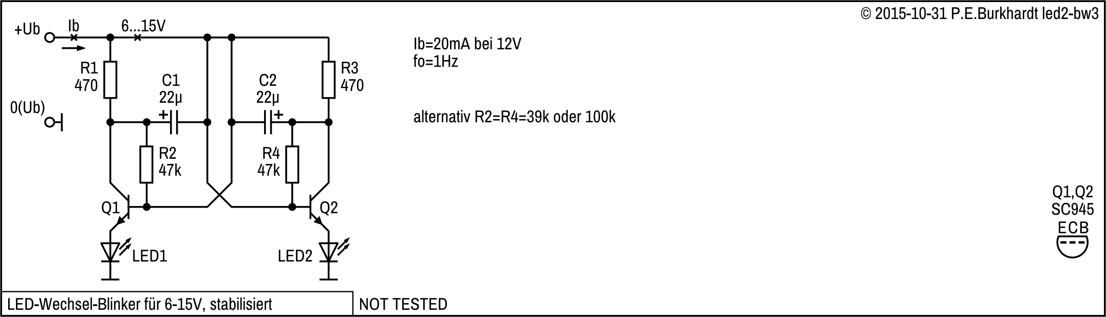 Die folgende Grundschaltung eines AMV-Blinkers mit 2 komplementären Transistoren ergab sich aus der Analyse und dem Umzeichnen vieler Blinker aus dem Web. Wird die Grundschaltung mit den dargestellten Erweiterungen versehen, ergeben sich unzählige Schaltungen, deren Bauelemente entsprechend der jeweiligen Anwendung speziell angepasst werden können. So spielen die gegebene Betriebsspannung Ub und die nötige LED-Leistung eine entscheidende Rolle bei der Schaltungsauswahl und bei deren Dimensionierung.