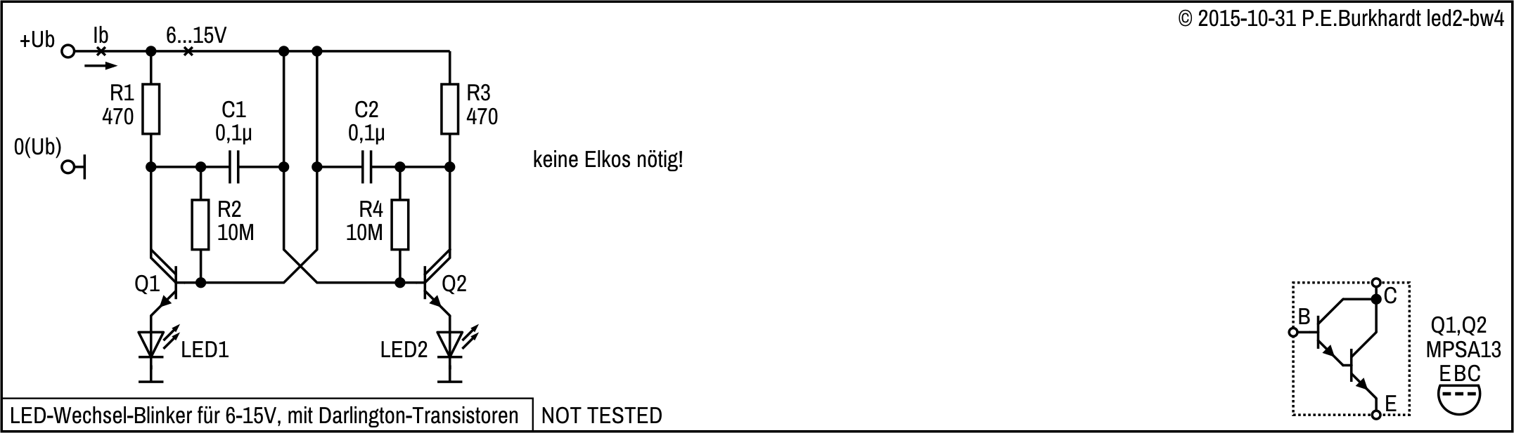 Es kursieren viele Blinkerschaltungen im Web, die mit komplementären Transistoren arbeiten. Um herauszufinden, was denn eigentlich die vielen Schaltungen unterscheidet, habe ich versucht, eine gewisse Systematik zu entwickeln. Ausgehend von den folgenden 4 Schaltungstests entstand dann die im darauffolgenden Abschnitt beschriebene Komplementär-Grundschaltung mit diversen Erweiterungen.
