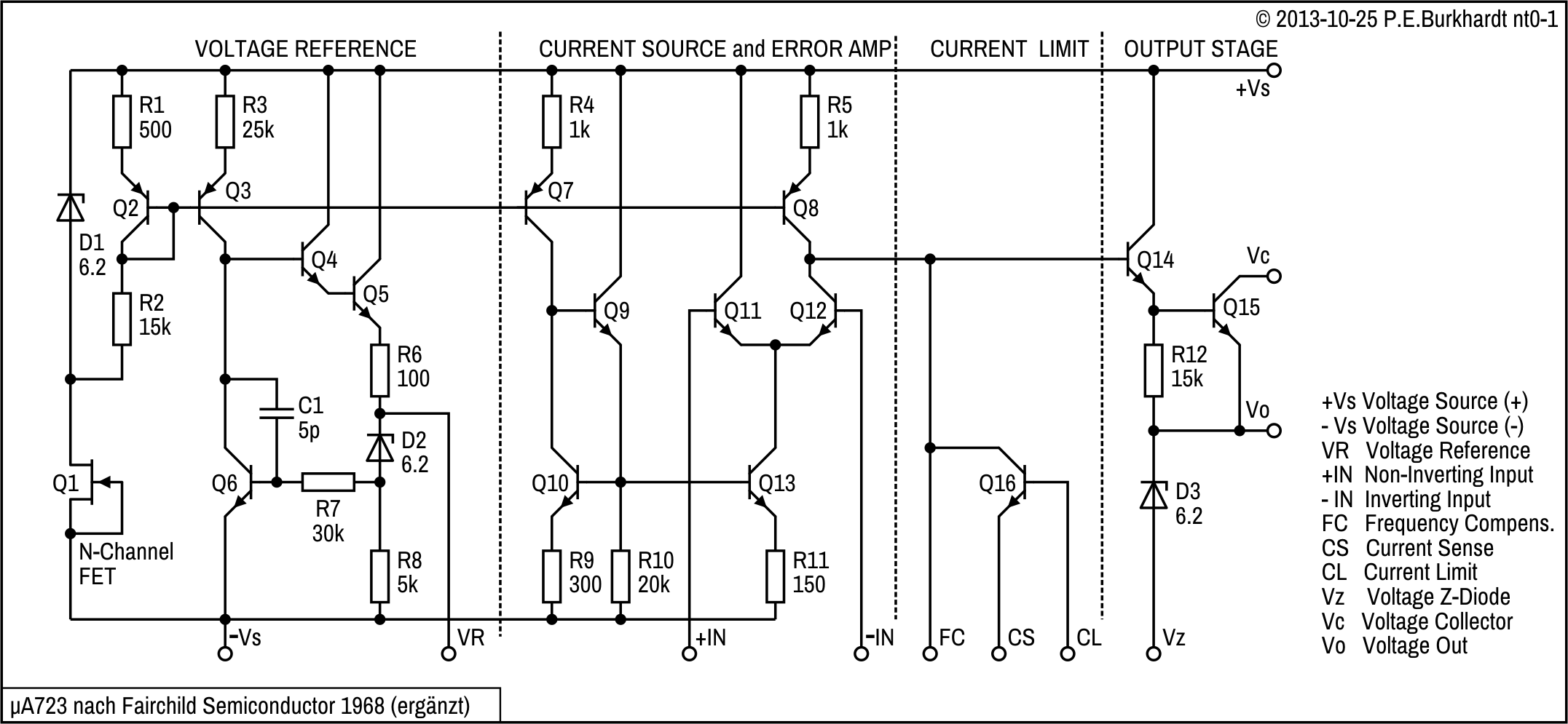 Anhand der folgenden Innenschaltung von Fairchild sei die prinzipielle Wirkungsweise beschrieben. Neuere 723-Schaltpläne sehen wesentlich komplizierter aus (mehr Transistoren). Ursache ist vermutlich ein moderneres Chip-Design mit weniger Widerständen.