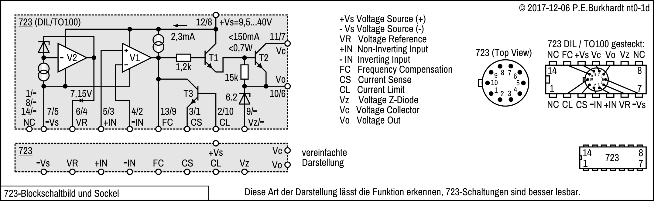 Der 723-Anschluss Vz (Pin 9) ist nur beim DIL14- und SO14-Gehäuse vorhanden. Beim runden TO-100- und beim DIL10-Gehäuse fehlt dieser Anschluss mit der 6,2-Z-Diode.