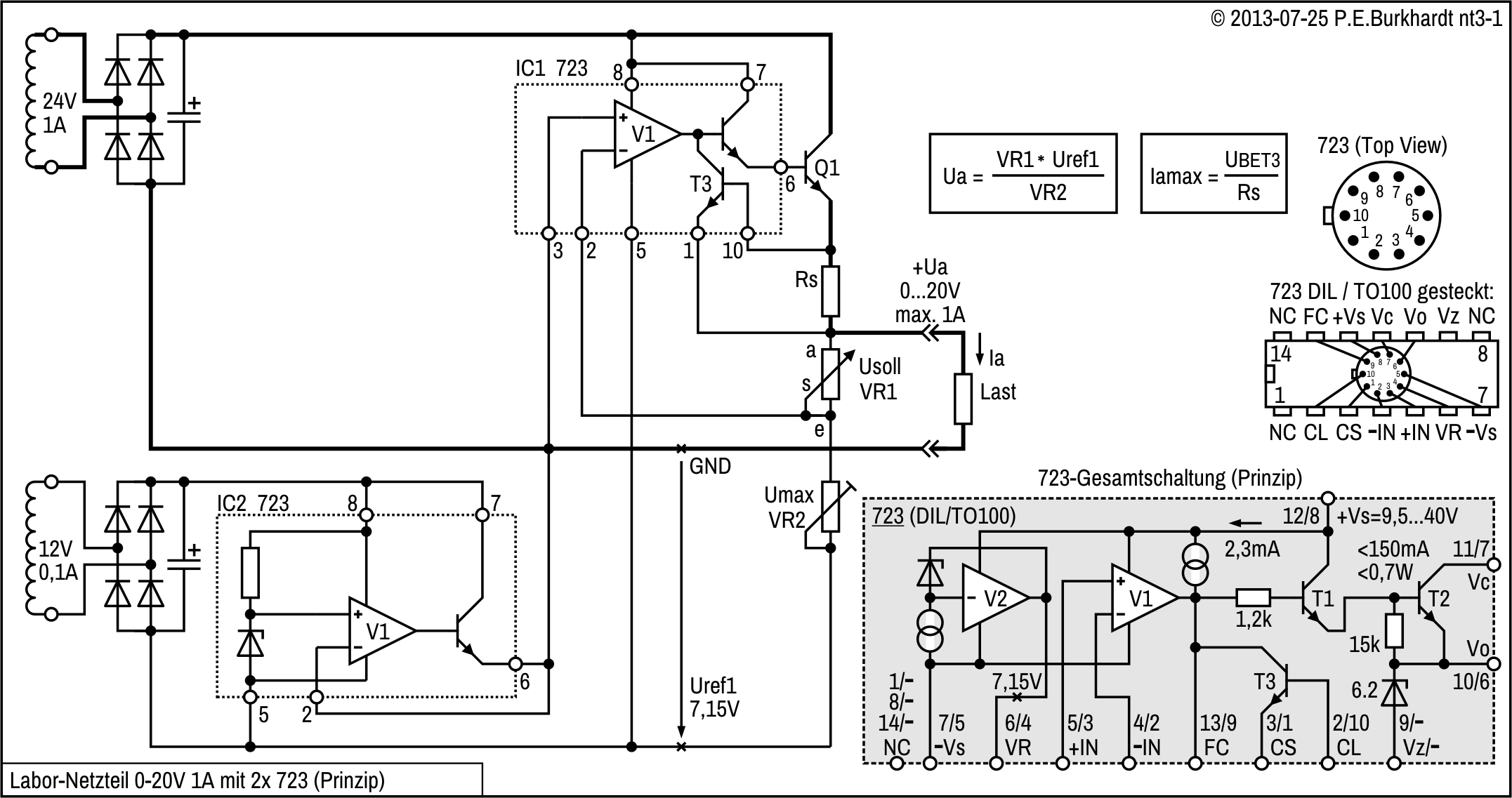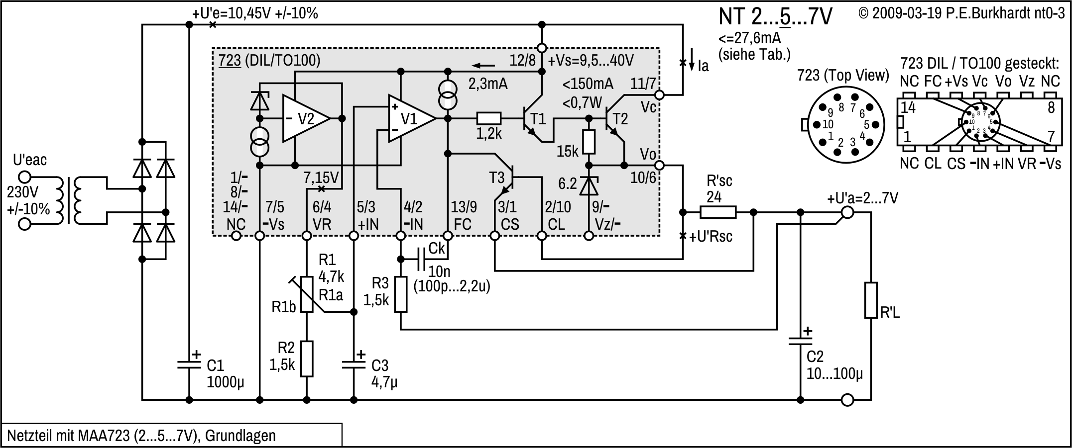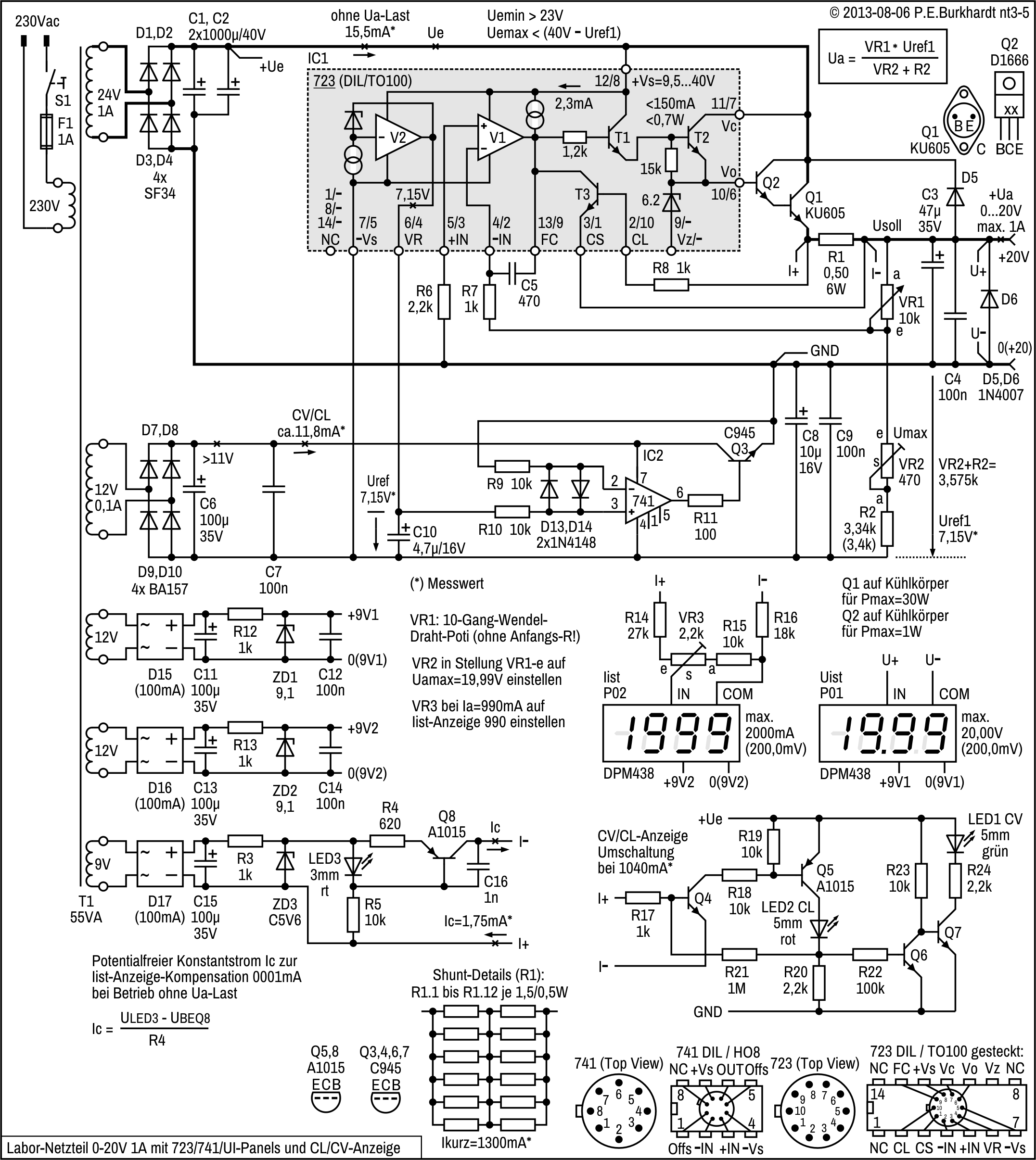 Die Strombegrenzung (nicht dargestellt) wird mit Shunt und dem internen 723-Transistor T3 realisiert.