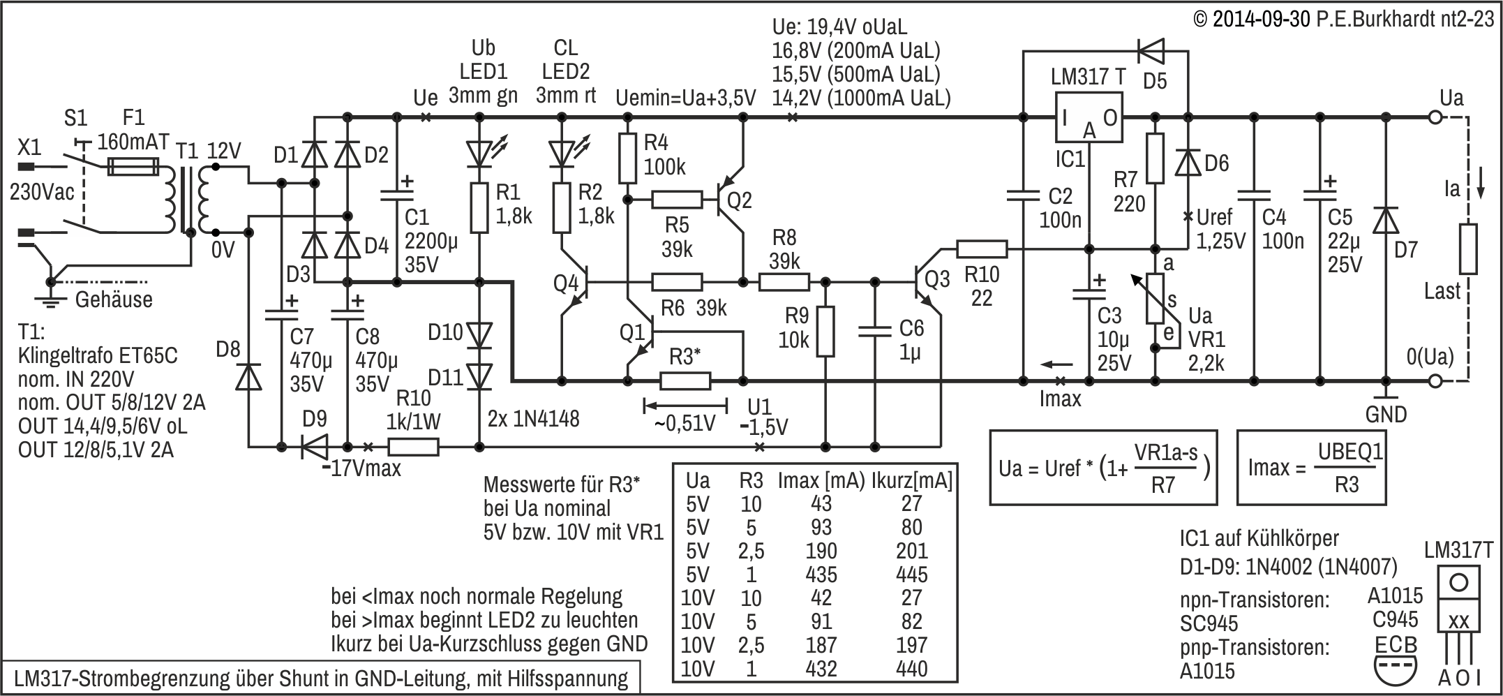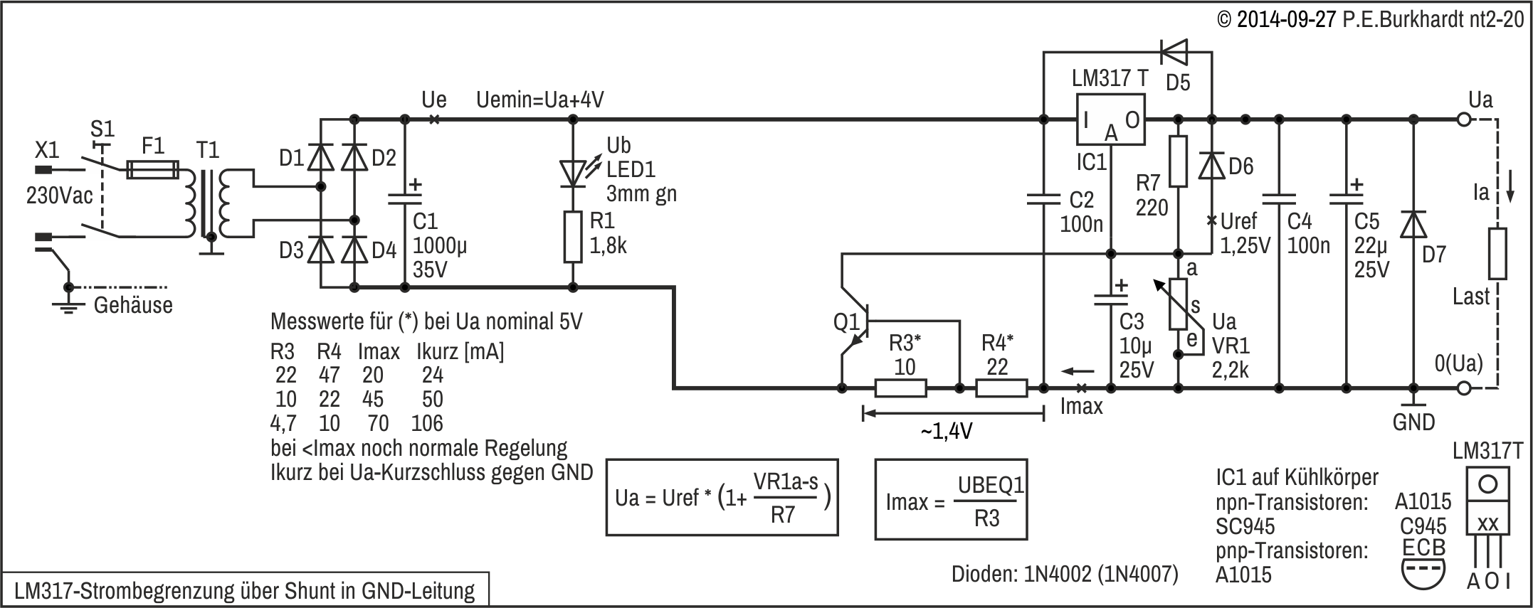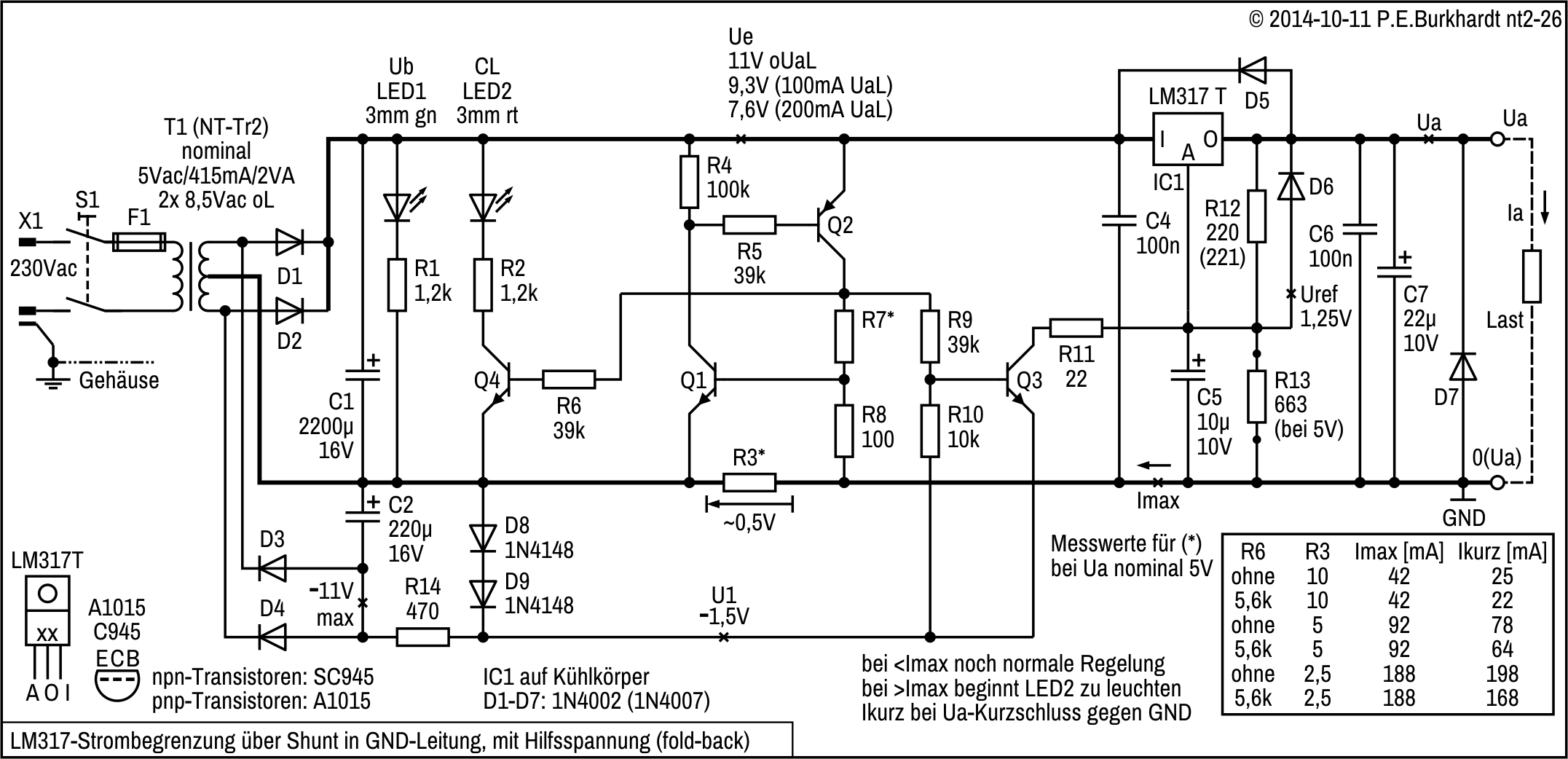 Die Strombegrenzung (nicht dargestellt) wird mit Shunt und dem internen 723-Transistor T3 realisiert.