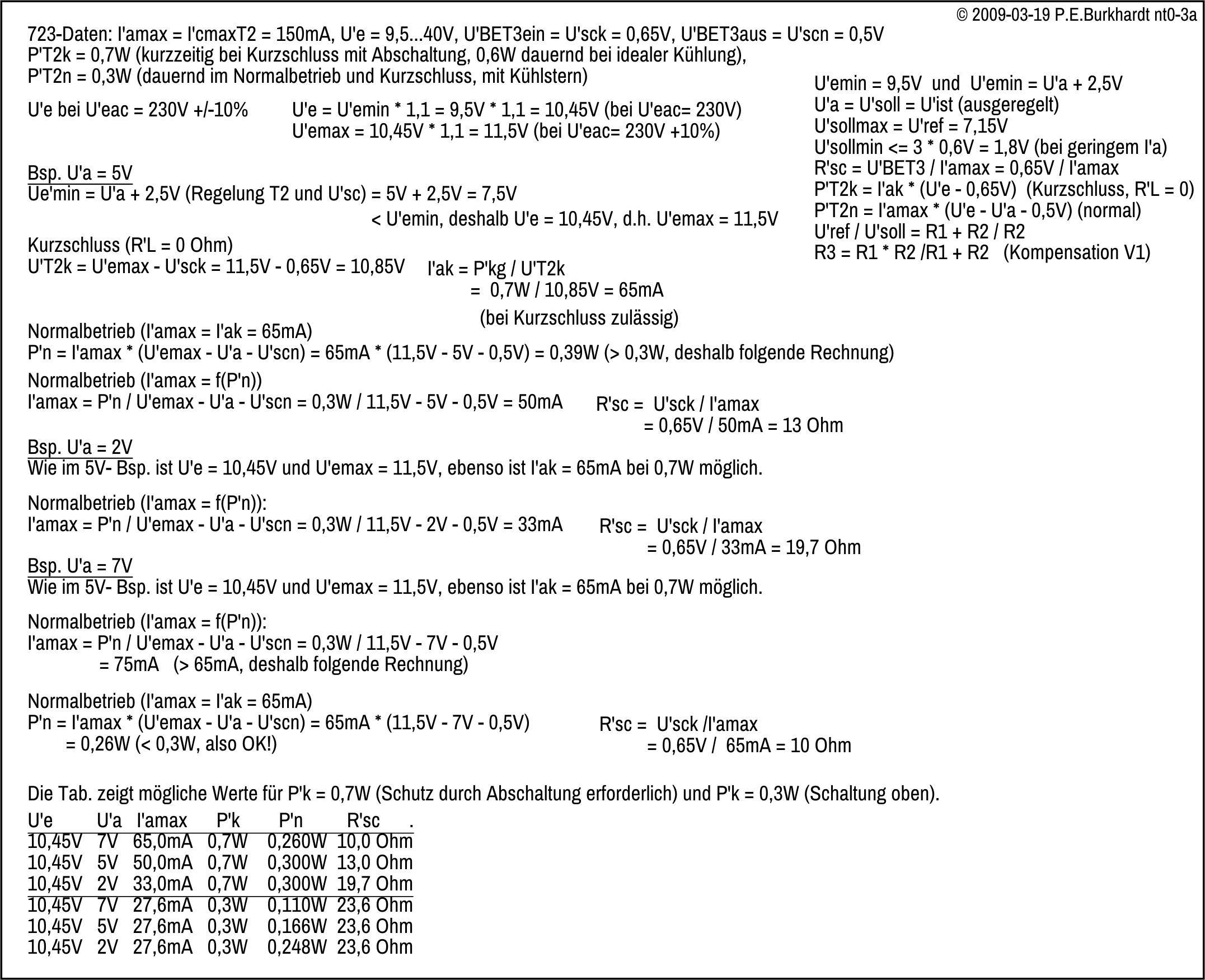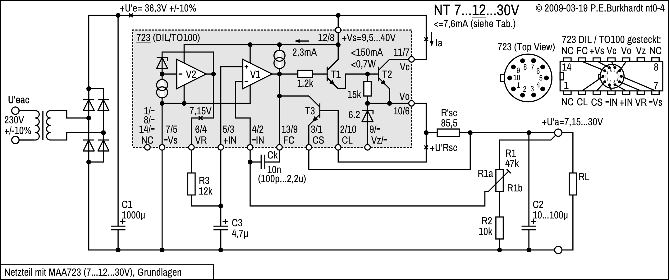 Die folgenden Bilder enthalten Schaltung und grundsätzliche Berechnungshinweise für den Einsatz des 723 ohne zusätzlichen Leistungstransistor im Ua-Bereich 7 bis 30 V.