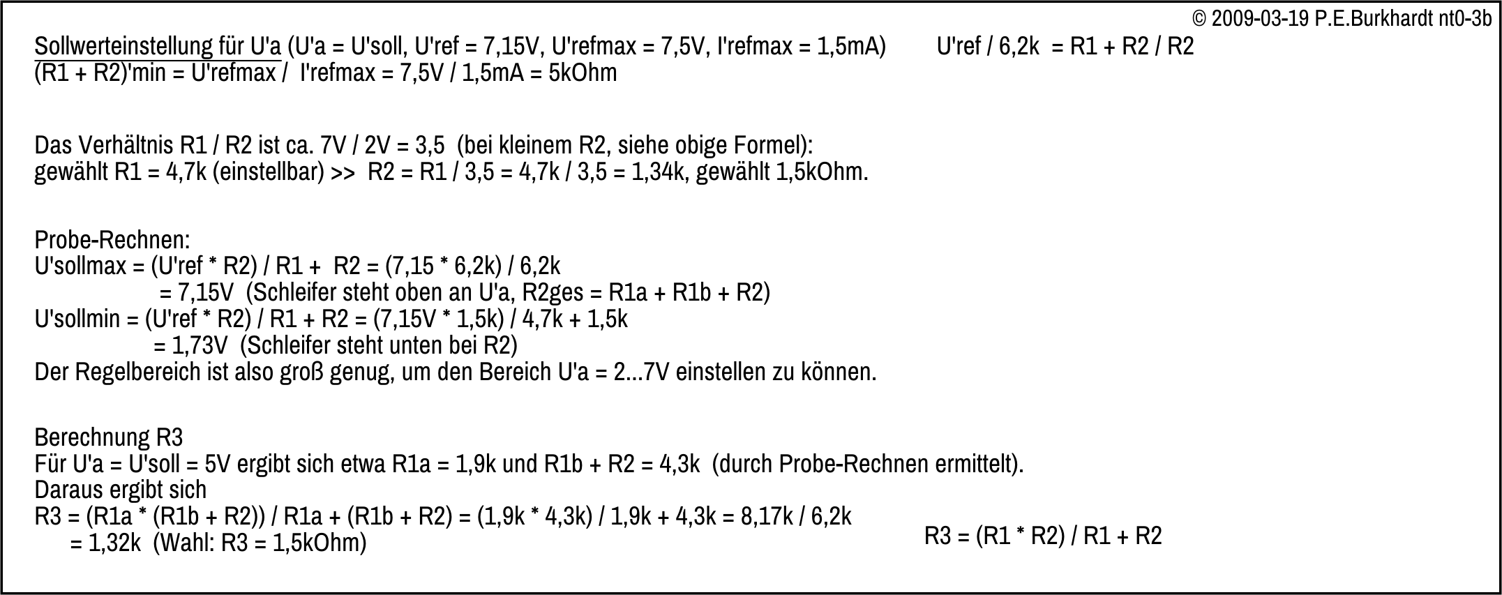 Die maximale Ausgangsspannung Uamax ergibt sich, wenn der Schleifer VR1s auf e (Ende) steht. Damit ist VR1 voll wirksam. Das VR1-e-Potential gegenüber +Ua wird vom Teilerverhältnis des Pfades VR1-VR2-R2 bestimmt. Da aber das e-Potenial gegenüber dem Teiler-Fusspunkt im ausgeregelten Zustand genau der Referenzspannung Uref1 entspricht und konstant ist, ändert sich mit Änderung des VR1-Wertes die +Ua-Ausgangsspannung gegenüber GND.