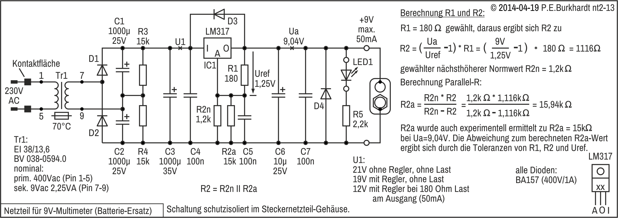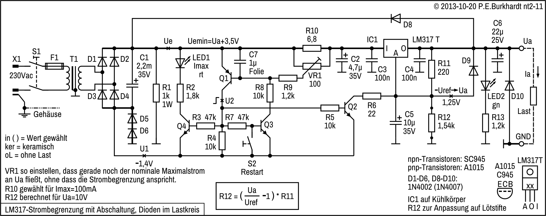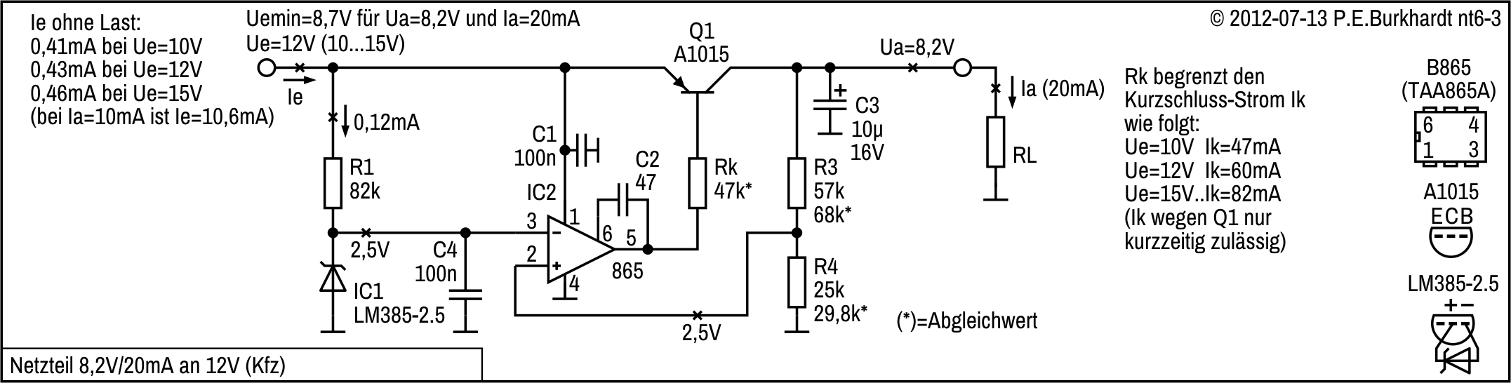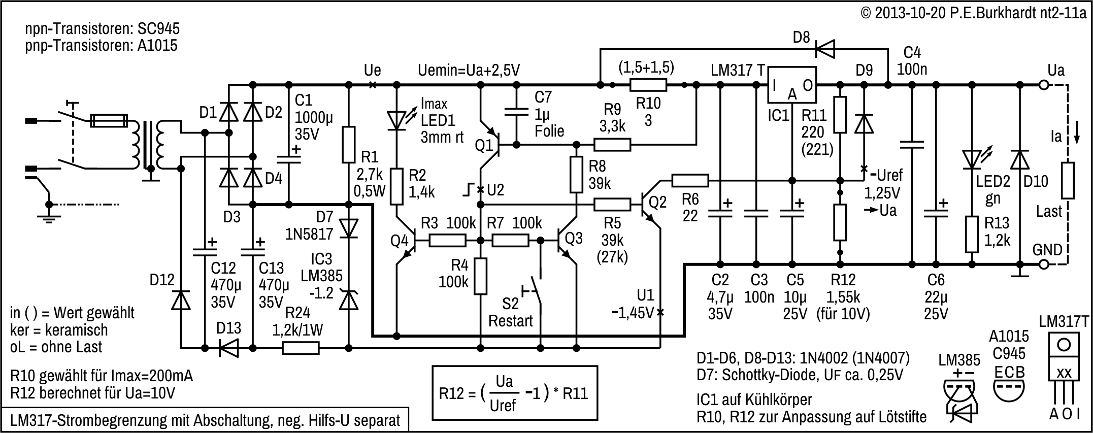 Die 12V-Einstellung erfolgt mit R4, R4a wurde zur genaueren Spannungseinstellung experimentell parallel geschaltet. Es ergaben sich 12,1 V.