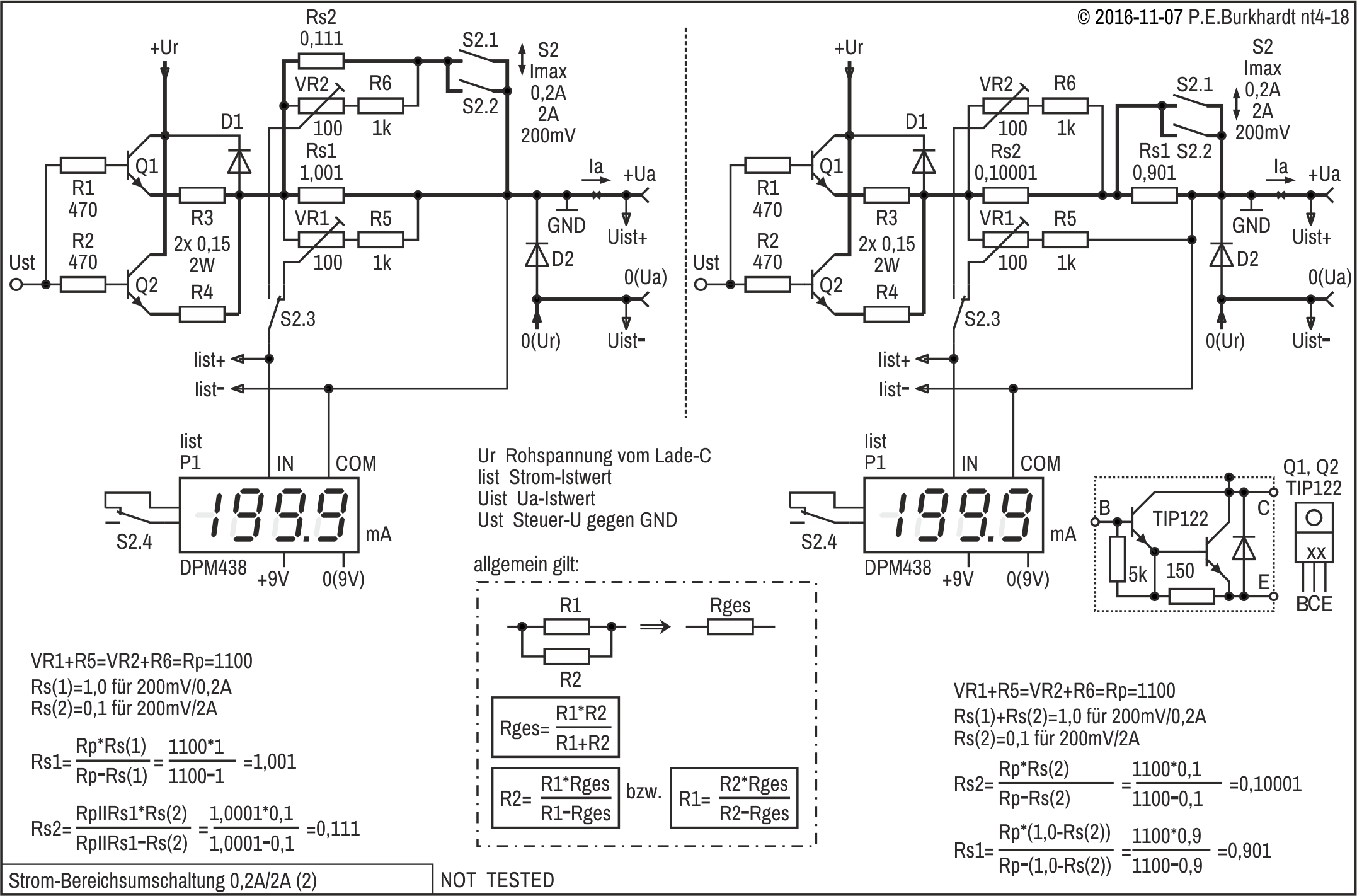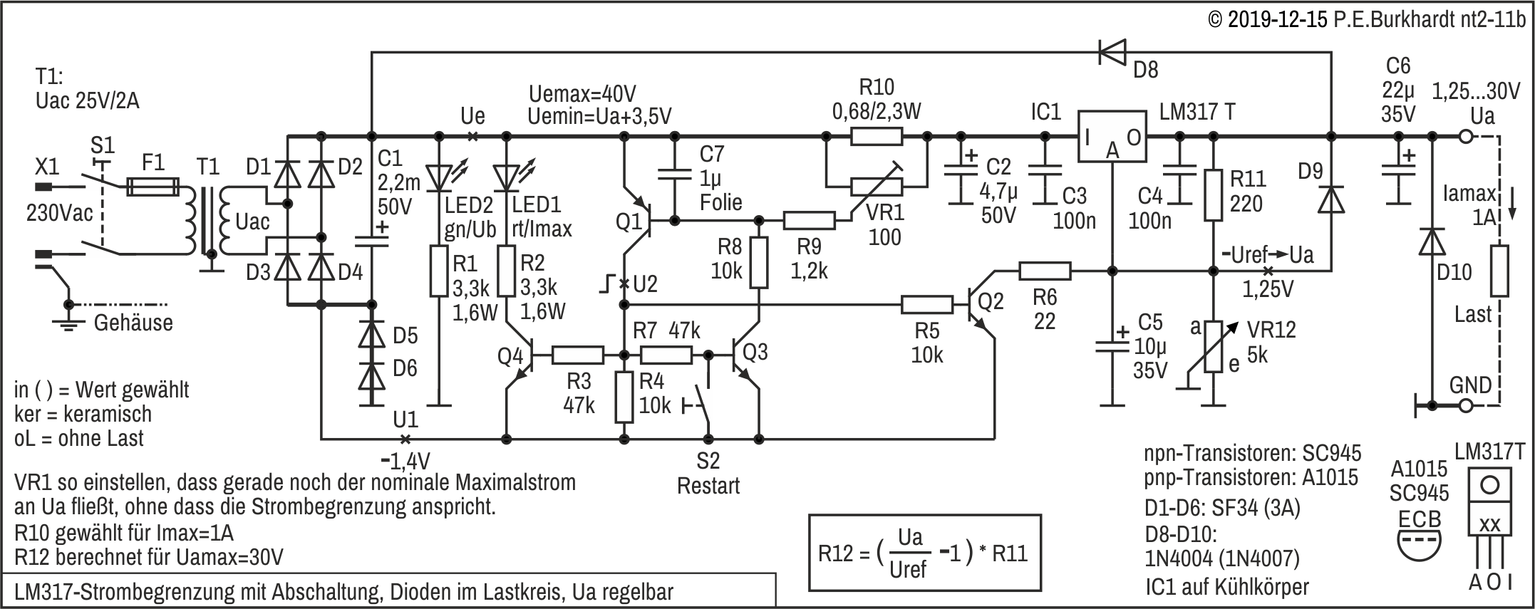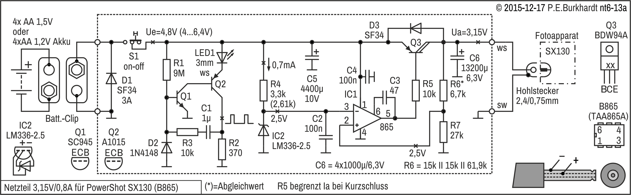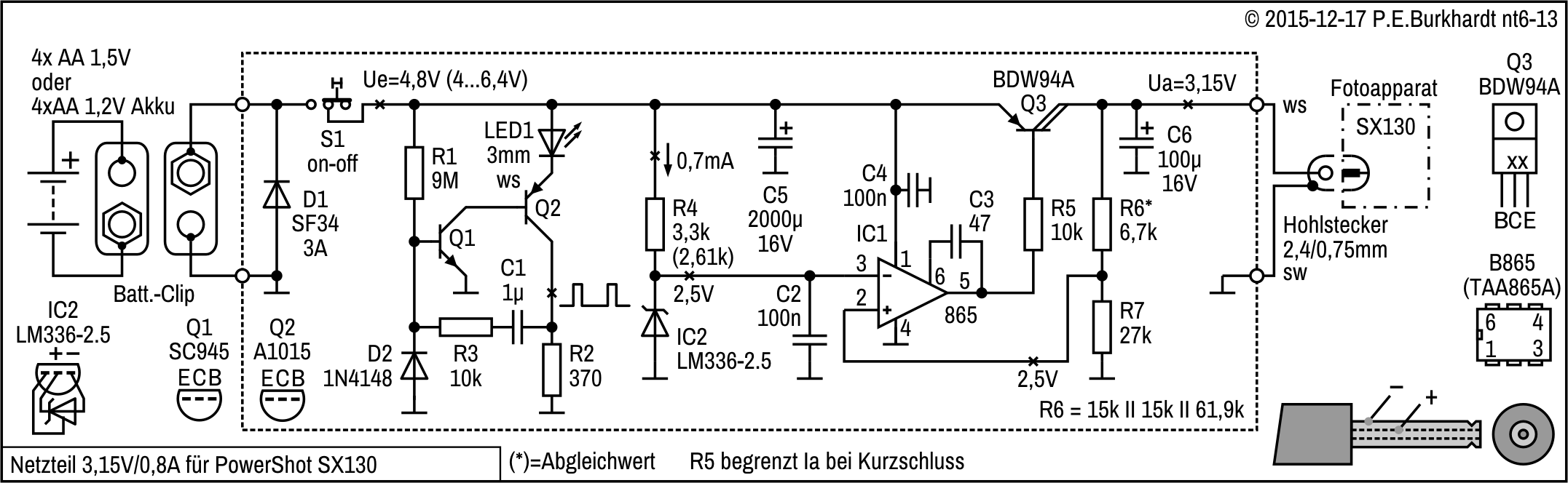 Die 12V-Einstellung erfolgt mit R4, R4a wurde zur genaueren Spannungseinstellung experimentell parallel geschaltet. Es ergaben sich 12,1 V.