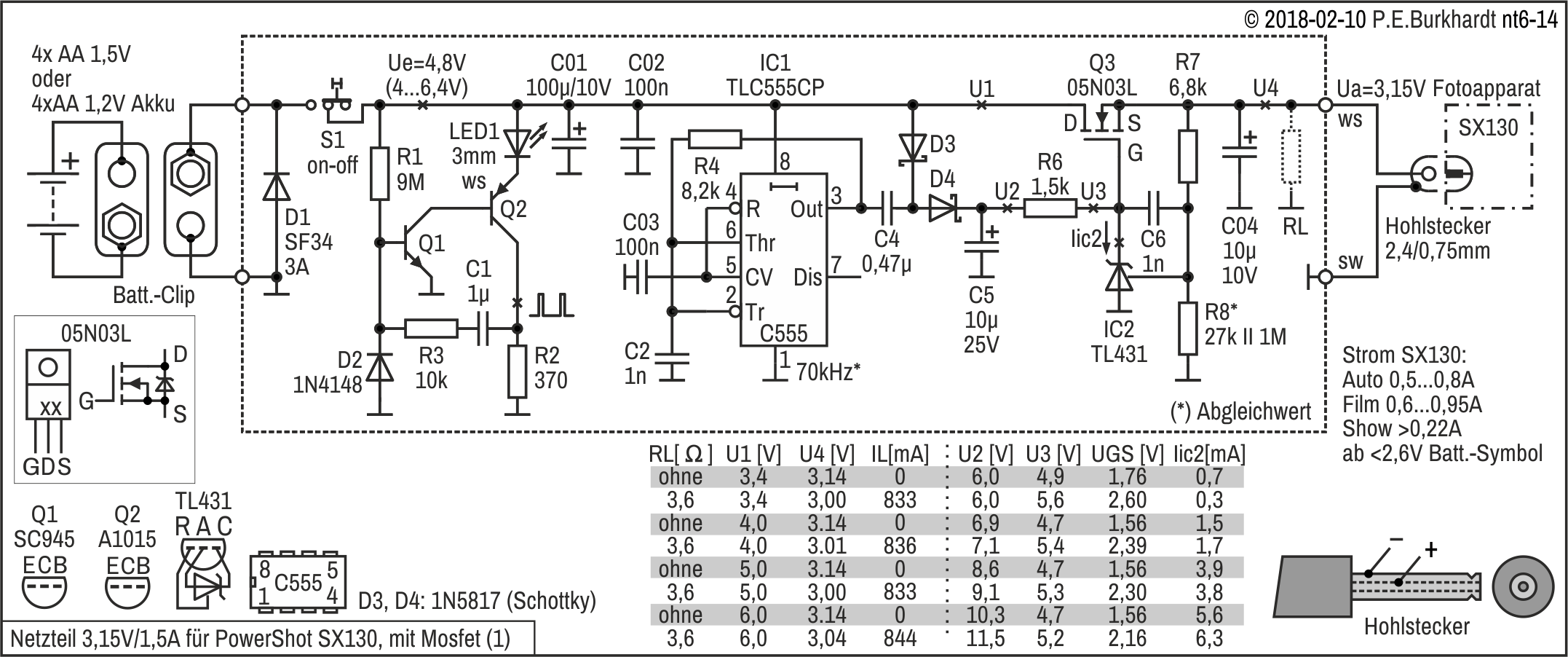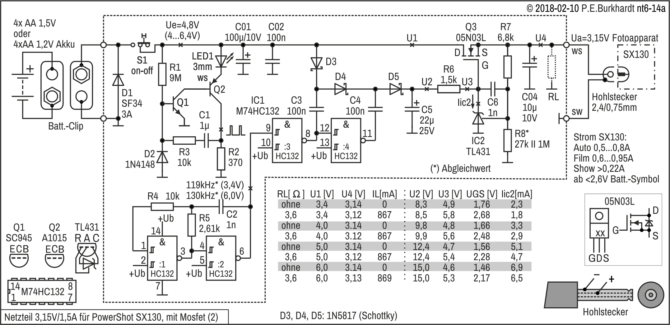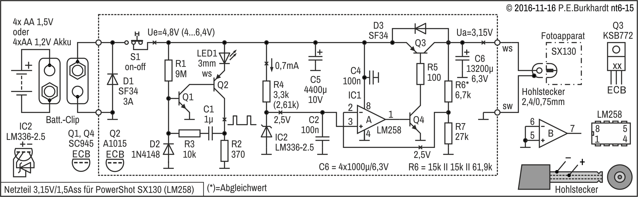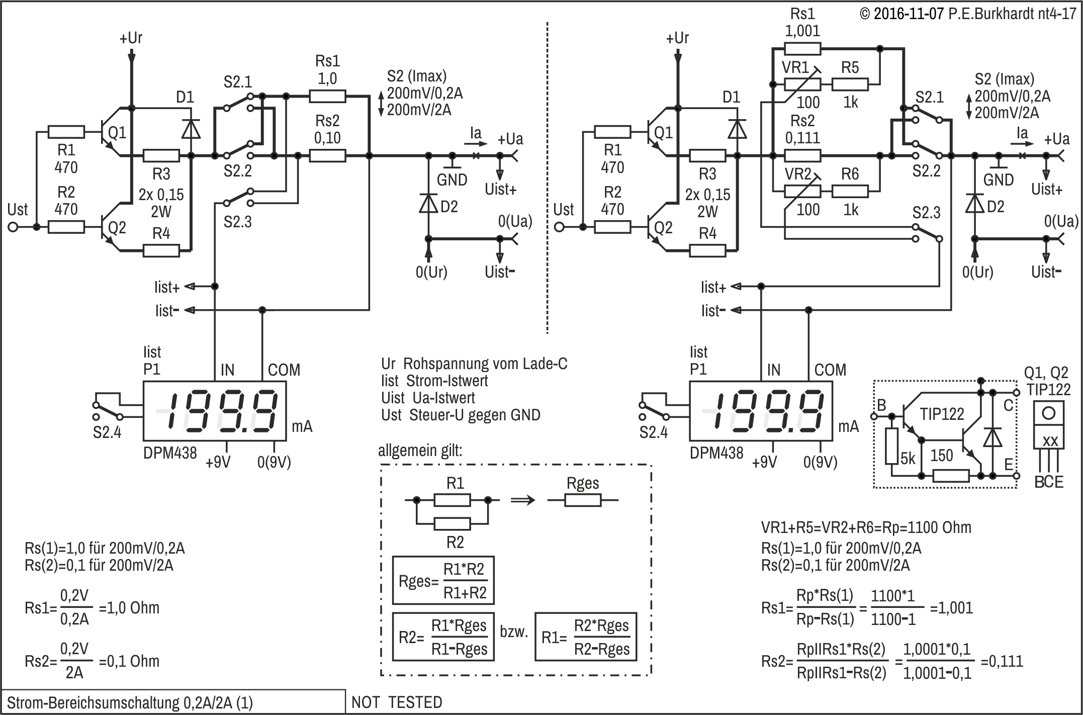 Die 12V-Einstellung erfolgt mit R4, R4a wurde zur genaueren Spannungseinstellung experimentell parallel geschaltet. Es ergaben sich 12,1 V.