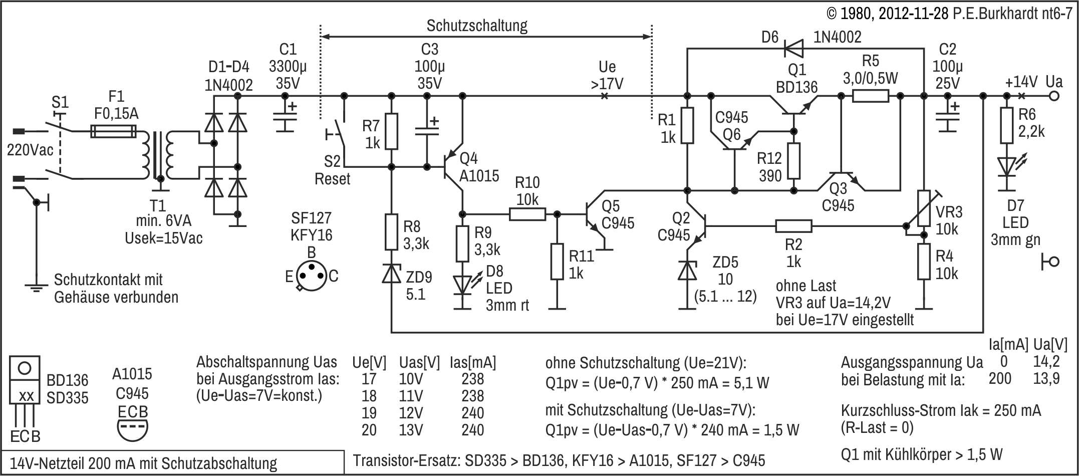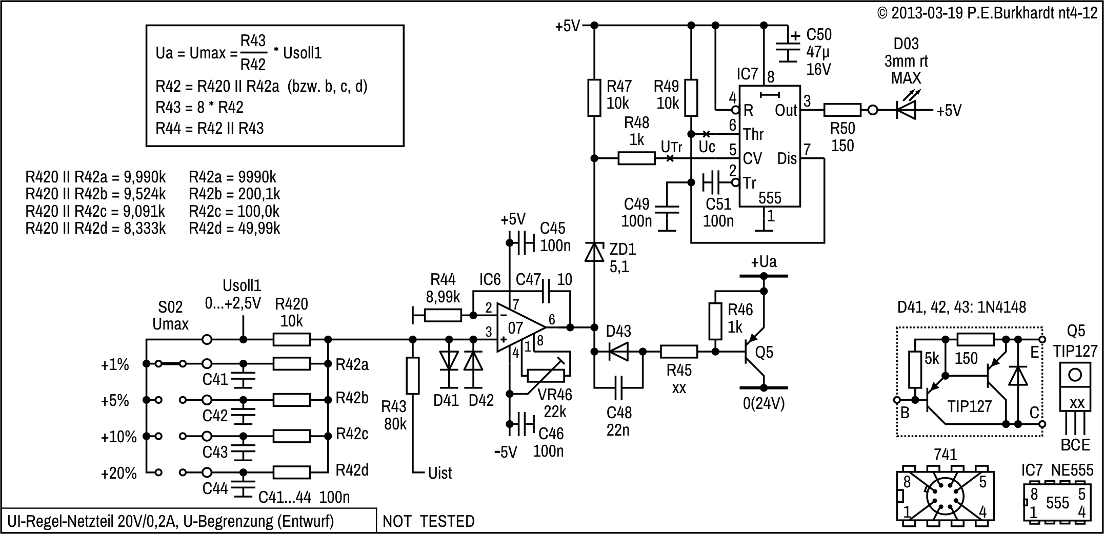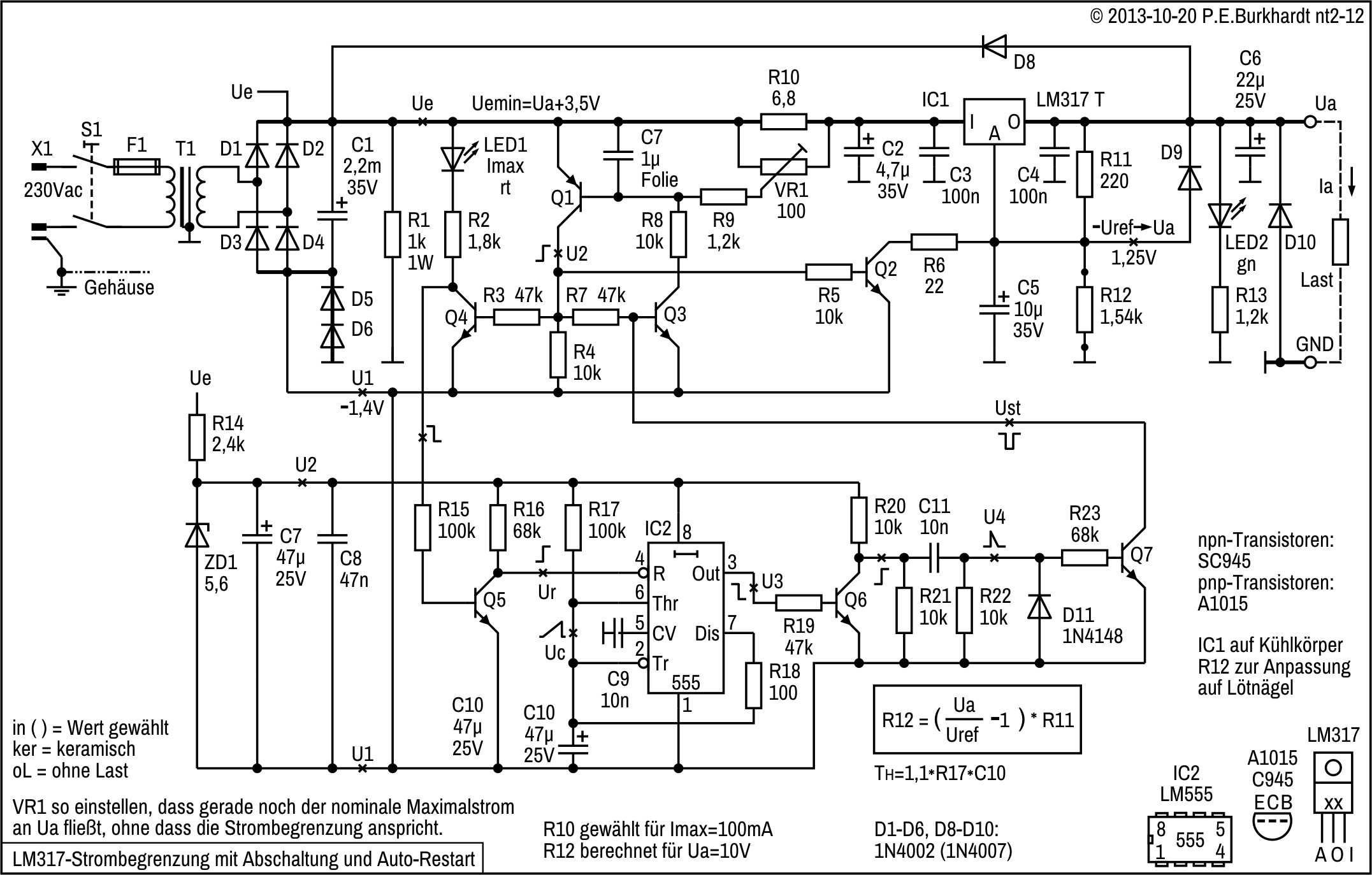 Die Schaltung basiert auf einem Vorschlag von Brother Thomas McGahee, publiziert in der Zeitschrift Electronics, Juni 1974. Allerdings ist jetzt die Schaltung mit der LED-Anzeige und zusätzlichen Widerständen und Kondensatoren etwas umfangreicher, aber eben auch sicherer. Messungen ergaben neben der Ua-Einstellbarkeit bis 0,0 mV (lt. Digital-Multimeter) ein gutes Regelverhalten entsprechend der 723-Daten.