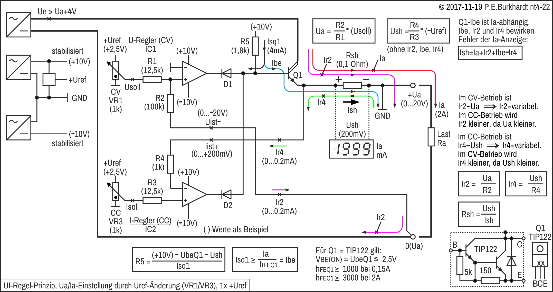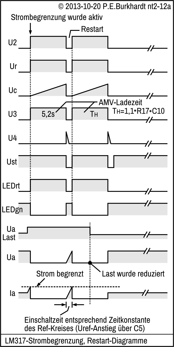 Eigentlich wird mit LED1 während der normalen U-Regelung die Rohspannung angezeigt. Normale U-Regelung bedeutet, dass +IN und -IN gleiches Potential haben und wegen +IN auf GND dieses Potential gleich dem GND-Potential ist. Erst bei Beginn der Strombegrenzung sinkt das Potential an -IN (U2) gegenüber GND ab, da der Regelstrecke T1-T2-Q2-Q1 Steuerstrom entzogen wird und die Ausgangspannung unter die mit VR1 eingestellten Spannung sinkt.