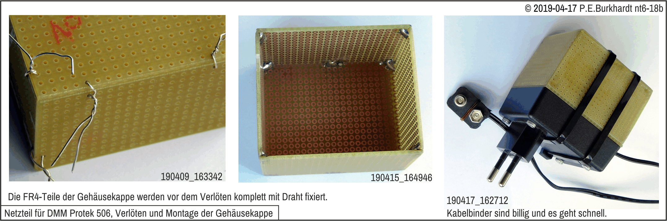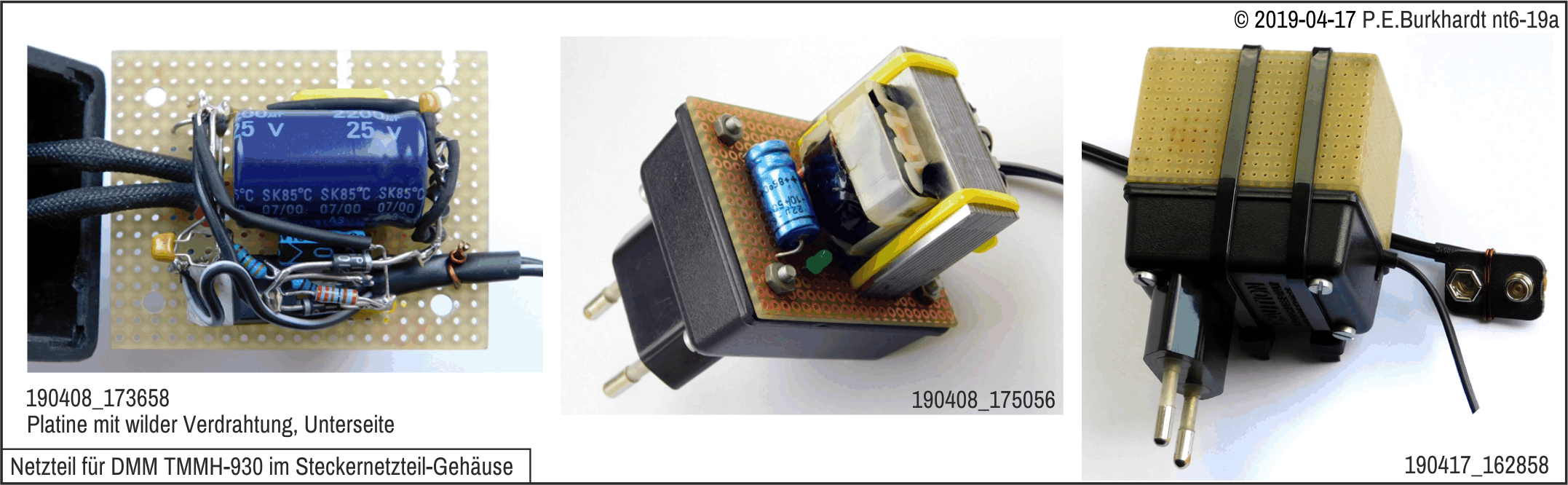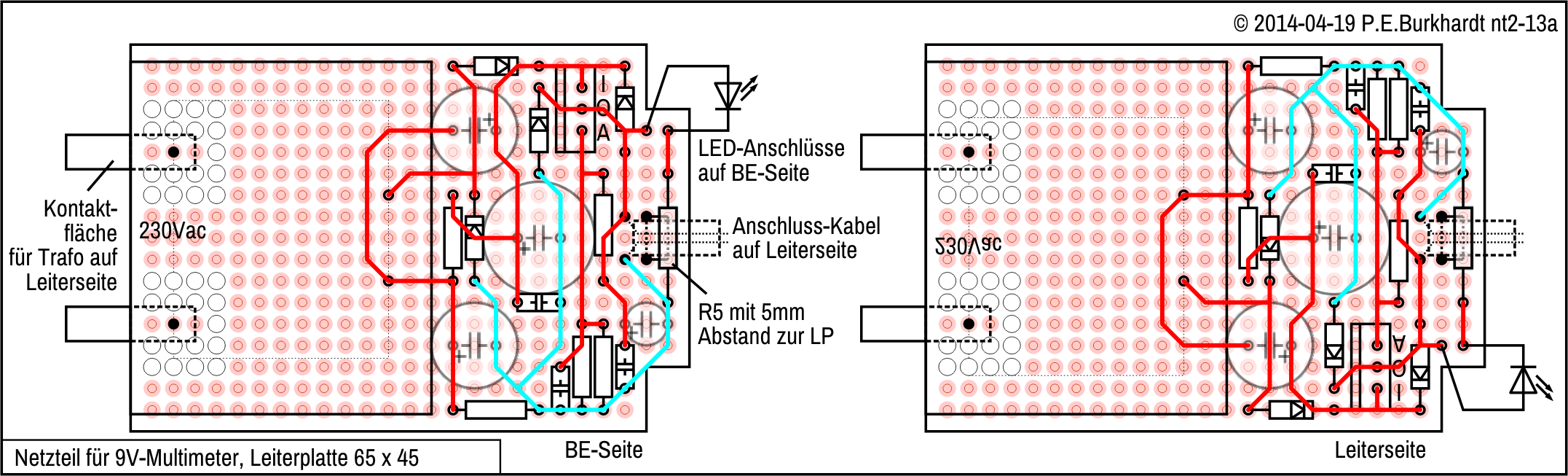 Eine Universal-Leiterplatte trägt alle Bauelemente einschließlich des Trafos. Ist die 230V-Netzspannung ebenfalls auf die Platine geführt, sollten Leiter-Mindestabstände zur Sekundärseite von mindestens 6 mm eingehalten werden. Nur so ist die nötige Spannungsfestigkeit erreichbar. Der Trafo selbst ist ein Steckernetzteil-Trafo mit integrierter Temperatur-Sicherung und getrennten Wickelkammern. Er ist also für Geräte mit Schutzmaßnahme "Schutzisolierung" geeignet.