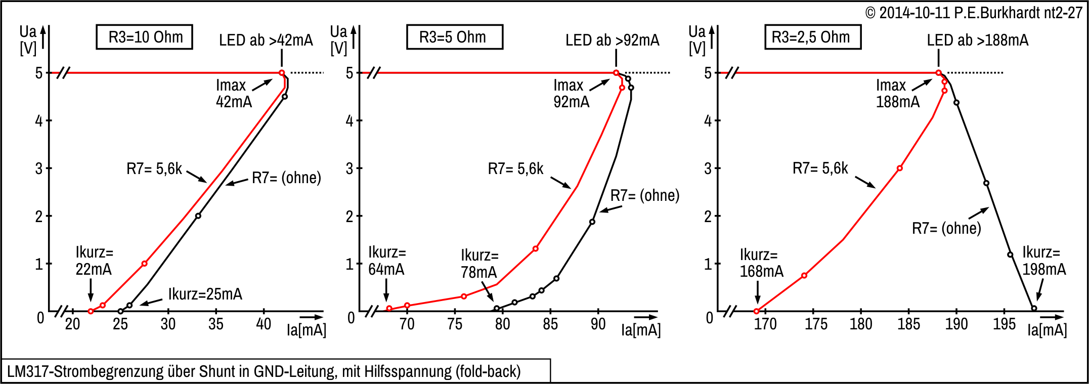 Da der 723 im Leerlauf (ohne Last) nur nominal 2,5 mA benötigt, muss die Belastbarkeit der Ue-Qelle nur wenige mA größer als der Kurzschluss-Strom Iak sein. 60 bis 70 mA reichen völlig. Widerstand R1 erlaubt bequem, den zugeführten Strom über die U1-Messung zu bestimmen.