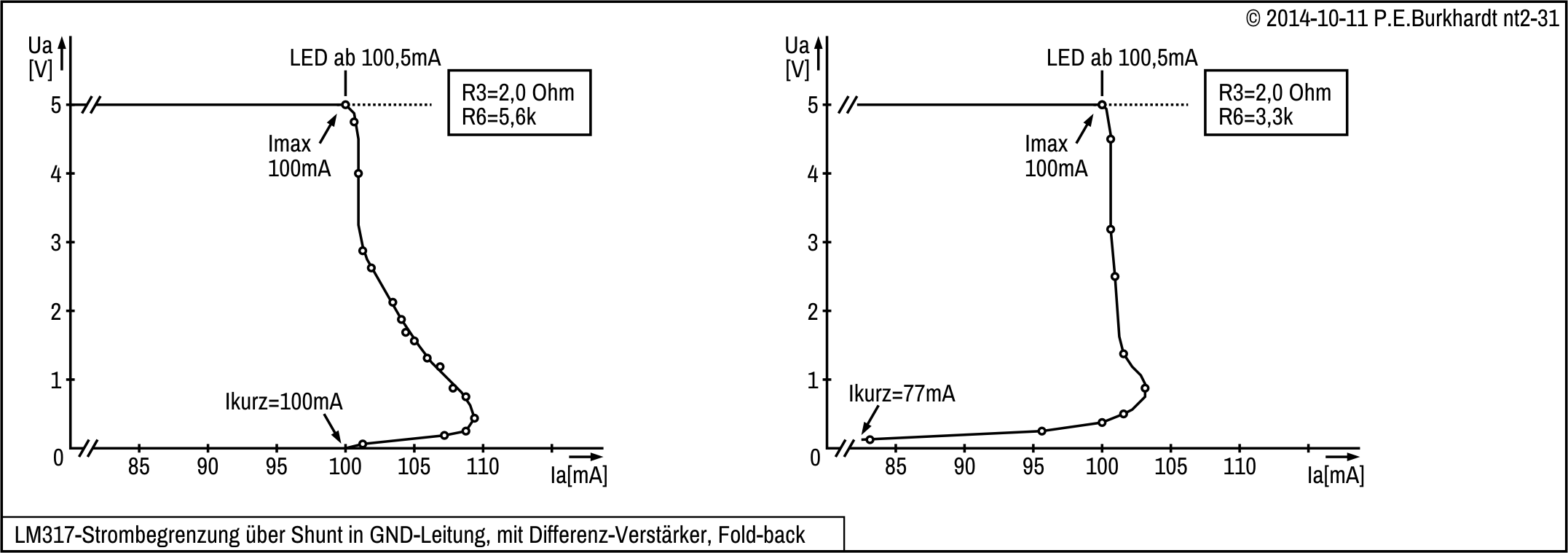 Beim I-Panel ist die Messbereichs-Anpassung etwas komplizierter. Zuerst ist R1 so zu dimensionieren, dass der gewünschte Strom von 1 A noch geregelt wird, bei Erhöhung aber die Strombegrenzung einsetzt.