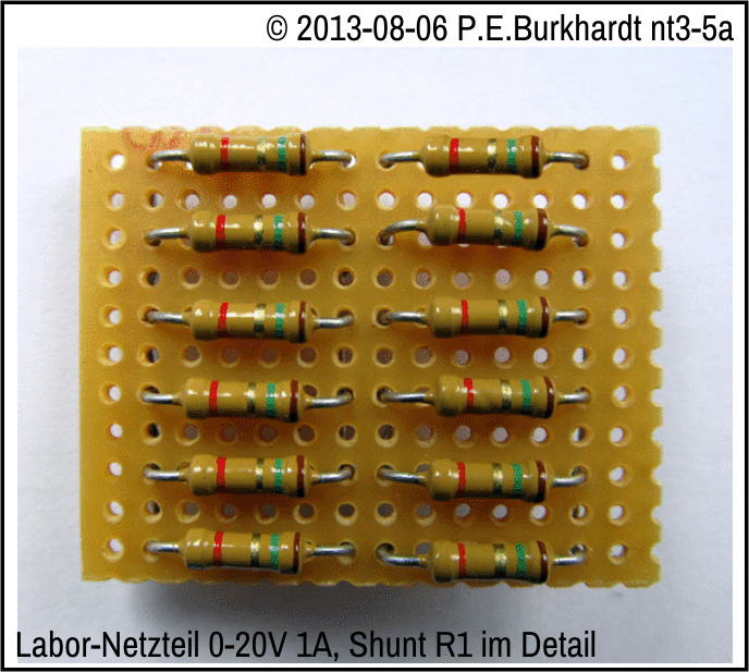 Vorteilhaft ist, den Shunt durch Parallel-Reihenschaltung einiger Widerstände zu realisieren. Die Widerstände sollten langzeitstabil sein, da deren Gesamtwert unmittelbar den angezeigten I-Messwert beeinflusst. Das Schaltbild zeigt, wie R1 verdrahtet wurde.