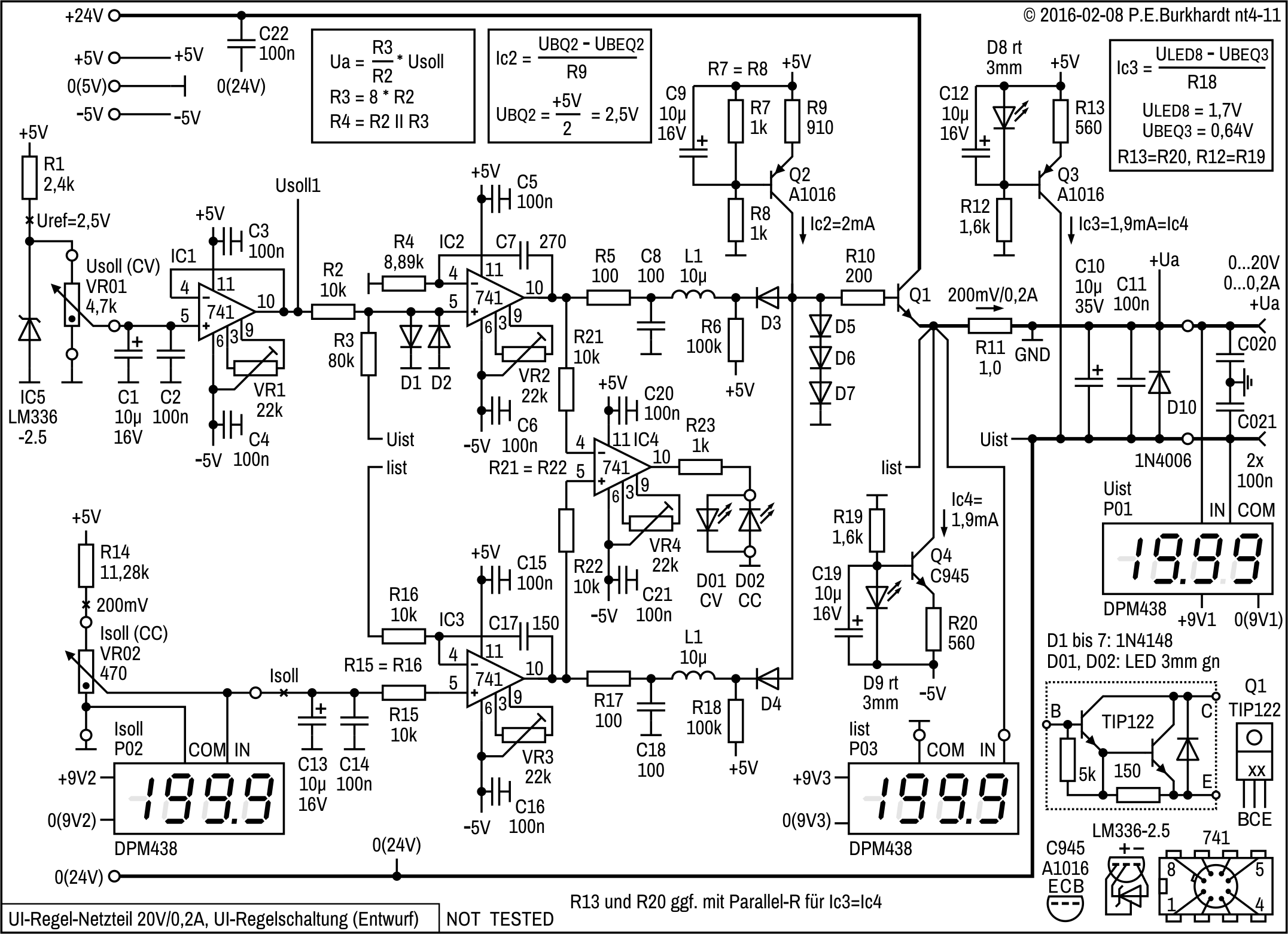 Bei diesem Netzteil wurde der zweite 723 durch eine diskrete Regelschaltung mit dem 741 ersetzt, um eine negative Referenzspannung zu erzeugen. Die Regelung für die Ausgangsspannung geschieht wie bei der vorigen Schaltung mit einem 723.