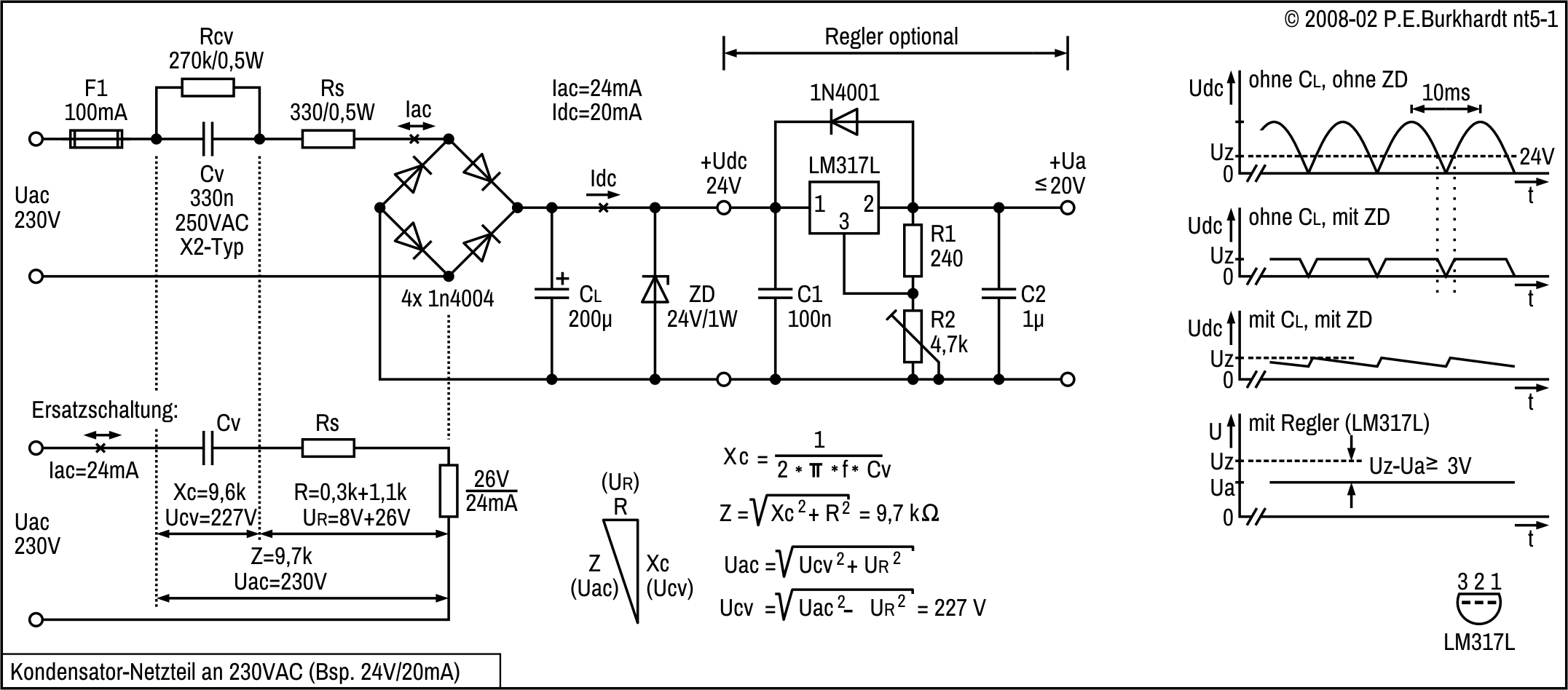 Während die minimale Rohspannung Uemin auch bei 20V/1A nicht unter 23 V (besser 24 V) abfallen darf, wird die maximale Rohspannung von der Spannungsfestigkeit des 723 (IC1) bestimmt. Da der 723-Anschluss -Vs auf dem gegenüber GND negativen Uref1-Potential liegt, muss Uref1 vom 723-Maximalwert (40 V) abgezogen werden. Damit ergibt sich Uemax = 32,85 V. Die Rohspannung Ue darf also auch ohne Last und bei Netzüberspannung (253 Vac) diesen Grenzwert von ca. 32 V nicht überschreiten.