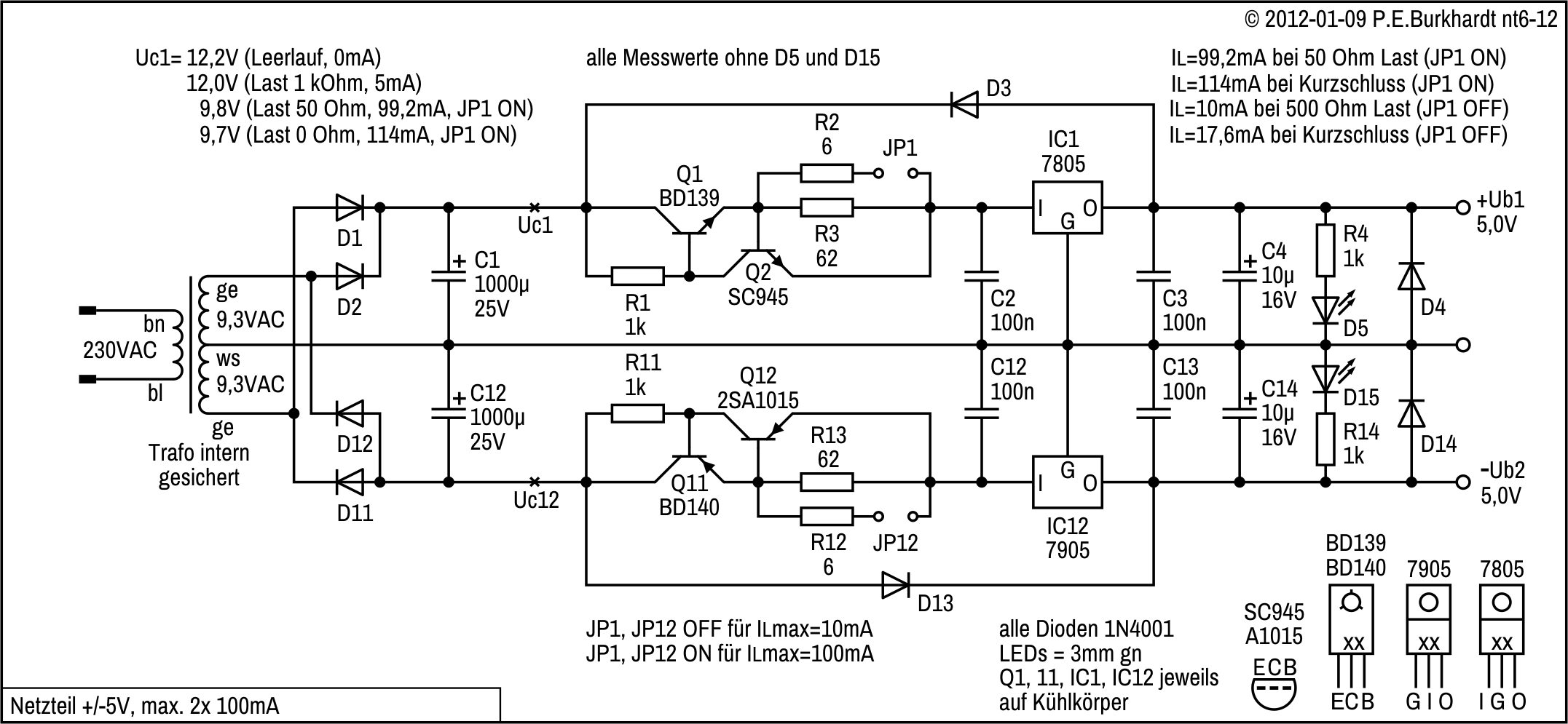 Auf der sicheren Seite ist man also, wenn Ie der Schaltung maximal 10 mA beträgt. Das bedeutet, die am Ausgang angeschlossene duale Last darf keinen größeren Strom zulassen.