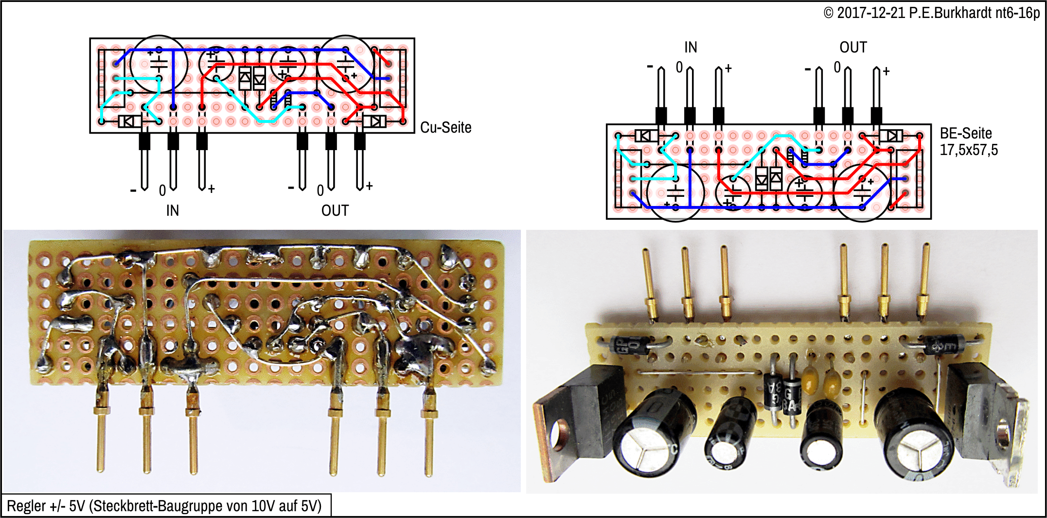 Mit 22 V Regler-Eingangsspannung reicht der Kleinleistungs-Regler LM317L nicht mehr aus, sondern es ist der normale LM317 erforderlich, allerdings ohne Kühlblech. Wegen der Spannungsverdopplung könnte jetzt auch ein Trafo mit nur 10 VAC verwendet werden.