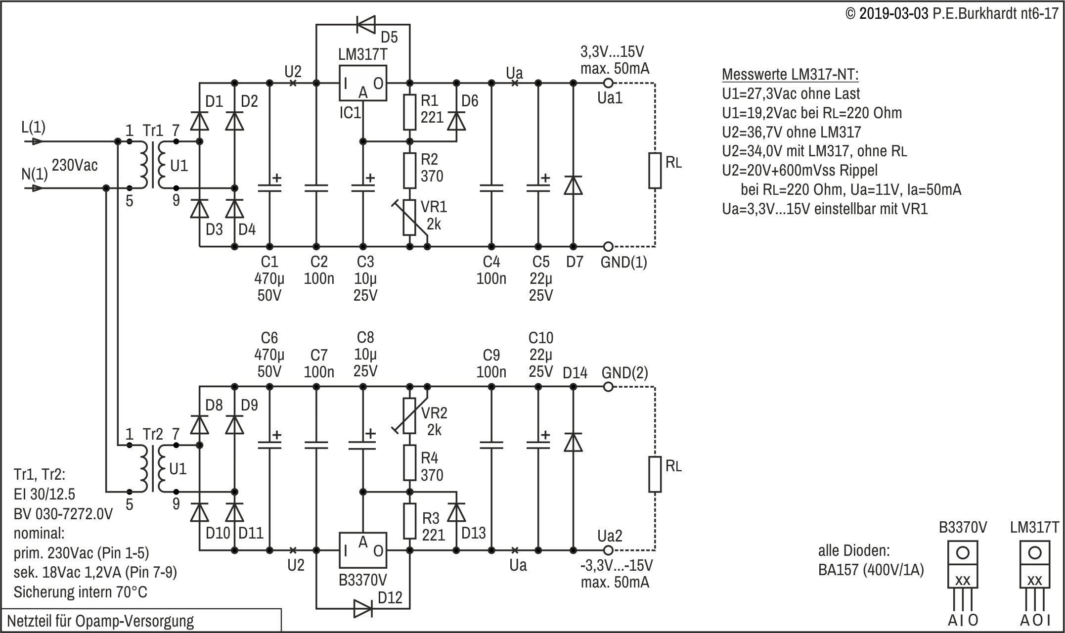Trafo Tr1 liefert nominal (bei 230 VAC) ca. 14 VAC. Damit der 12V-Regler genügend Eingangsspannung hat, ist eine symmetrische Spannungsverdoppler-Schaltung (nach Delon) nachgeschaltet. Die sich ergebende Ausgangsspannung beträgt theoretisch Ua = 2,83 * Ue (ohne Last). Gemessen wurde Ua = 22 V mit Last.