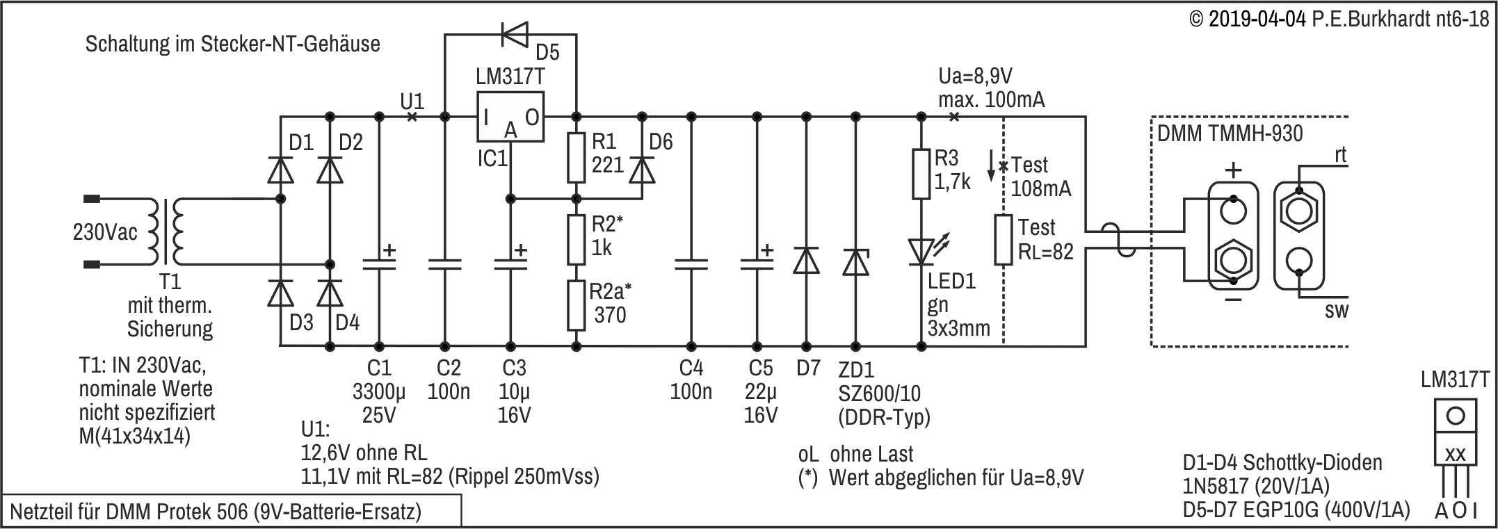 Ein eigener kleiner Trafo Tr1 mit Greatz-Brücke D1 bis D4 liefert die Eingangsspannung für den LM317L-Regler. Es sind mindestens 16 V erforderlich, um abzüglich Netzunterspannung und Rippel-Spannung noch 12 V am Reglerausgang zu erhalten.