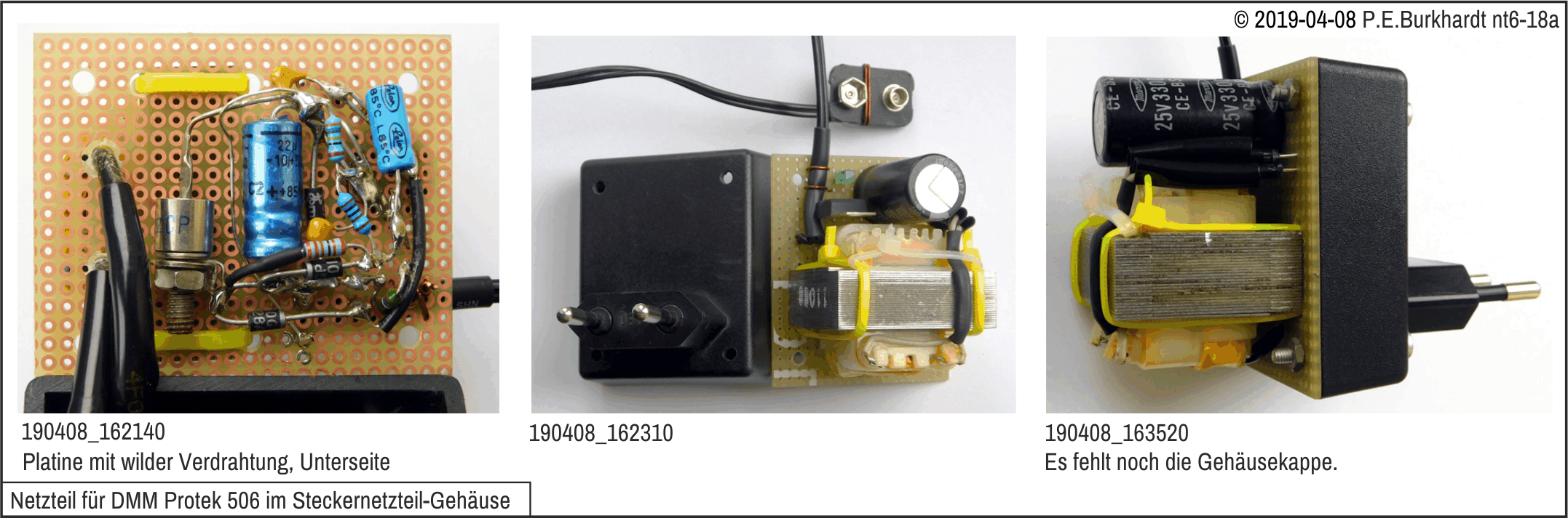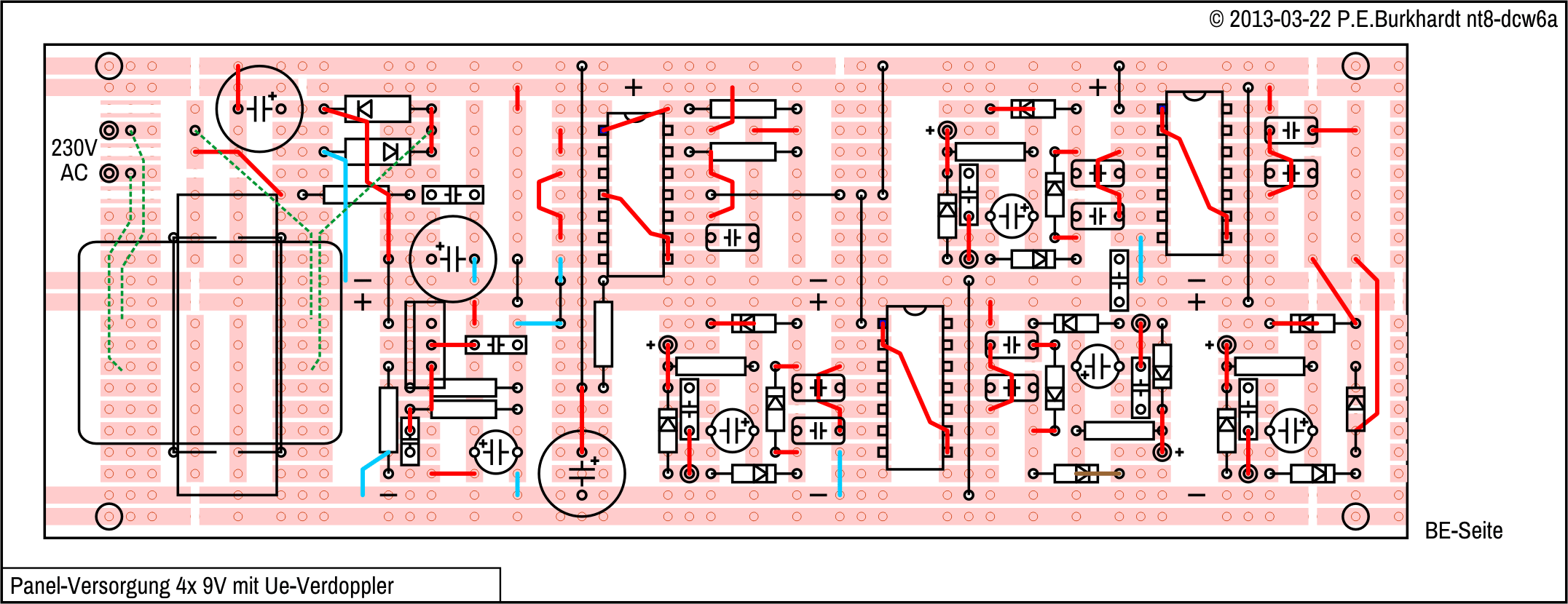 Die gesamte Schaltung wurde großzügig auf einer Universal-Leiterplatte aufgebaut. Durch genauere Messungen wurde jedoch festgestellt, dass der verwendete Trafo nicht ganz die benötigte Spannung bei Netzunterspannung (-10 %) und maximaler Last an allen 4 9V-Ausgängen lieferte. Es waren nominal nur 14 VAC messbar. Ein anderer Trafo mit nominal 15 VAC Ausgangspannung (wie im Bild angegeben) hätte zwar das Problem gelöst, stand aber nicht zur Verfügung.