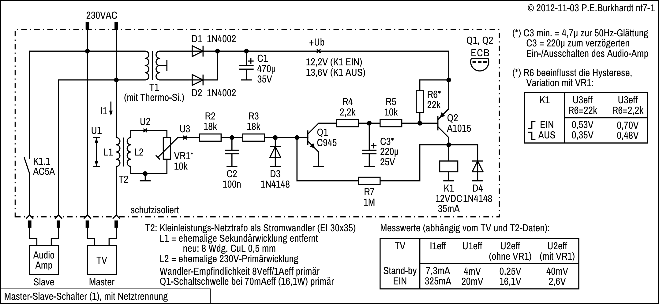 Zur Klangverbesserung ist am Flach-TV ein externer Audio-Verstärker notwendig. Soll dieser Verstärker gemeinsam mit der TV-Fernbedienung eingeschaltet werden, ist ein Master-Slave-Schalter (MSS) erforderlich. Im TV-Stand-By-Betrieb soll der Schalter nicht reagieren. Wird aber der TV (Master) per Fernbedienung eingeschaltet, muss der jetzt höhere TV-Netzstrom ausgewertet werden, um mit dieser Info den Audio-Verstärker (Slave) einschalten zu können.