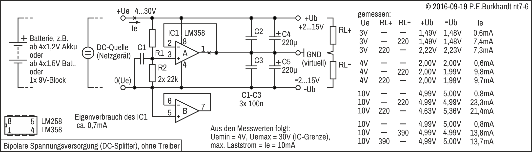 Kurz und gut, eine einzige Batterie- oder Akkuspannung von in Reihe geschalteten Zellen sollte nicht per Anzapfung aufgeteilt werden. Um nun die bipolare Spannungsquelle zu erhalten, bietet es sich an, die Masse elektronisch, d.h. virtuell zu erzeugen. Genau das leisten die sogenannten DC-Splitter, wie sie im Folgenden beschrieben sind.