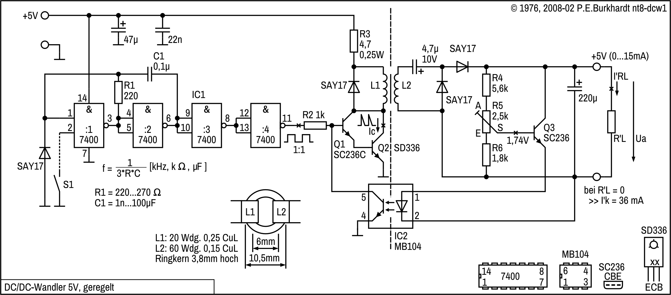 Eine Oszillator-Regelung könnte den Wirkungsgrad verbessern. Dazu ist aber eine geeignete galvanisch trennende Rückführung vom Ausgang zum Eingang erforderlich, z.B. ein Opto-Koppler. Für Batterie-Geräte mit 9V-Batterie wäre dieser Aufwand sicherlich gerechtfertigt. Bei Netzversorgung reicht die Stabilisierung mit Z-Diode.