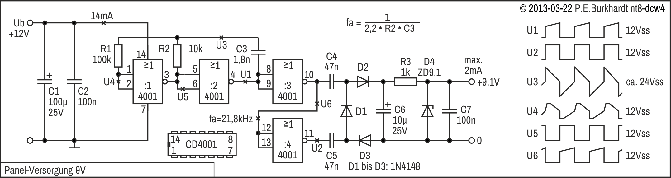 Gatter 3 und 4 liefern ein gegenphasiges Rechteck-Signal. Damit wird die Verdopplerschaltung (D1 bis D3 und Lade-C C6) über C4/C5 gespeist. Die Koppelkapazitäten sollten möglichst niedrig sein (für eine hohe INPUT/OUTPUT-Trennung), andererseits müssen sie aber die gewünschte Leistung übertragen können. In der gewählten Dimensionierung ergeben sich ca. max.3 mA bei noch 9 V über der Z-Diode D4. Durch die Z-Diode fließen also noch 1 mA, wenn am Ausgang 2 mA entnommen werden. Dieser Strom wird aber für ein Panel meist nicht benötigt, entsprechend mehr Strom fließt dann durch die Z-Diode.