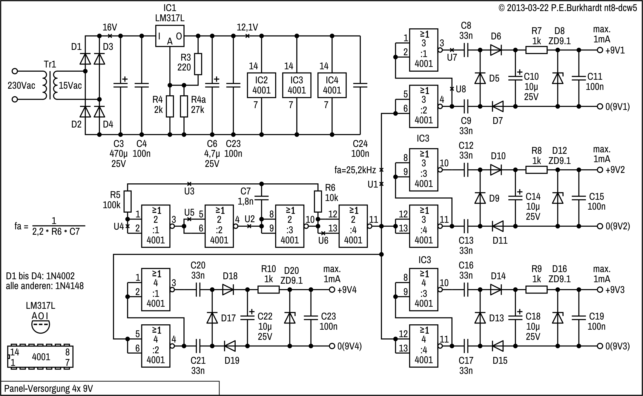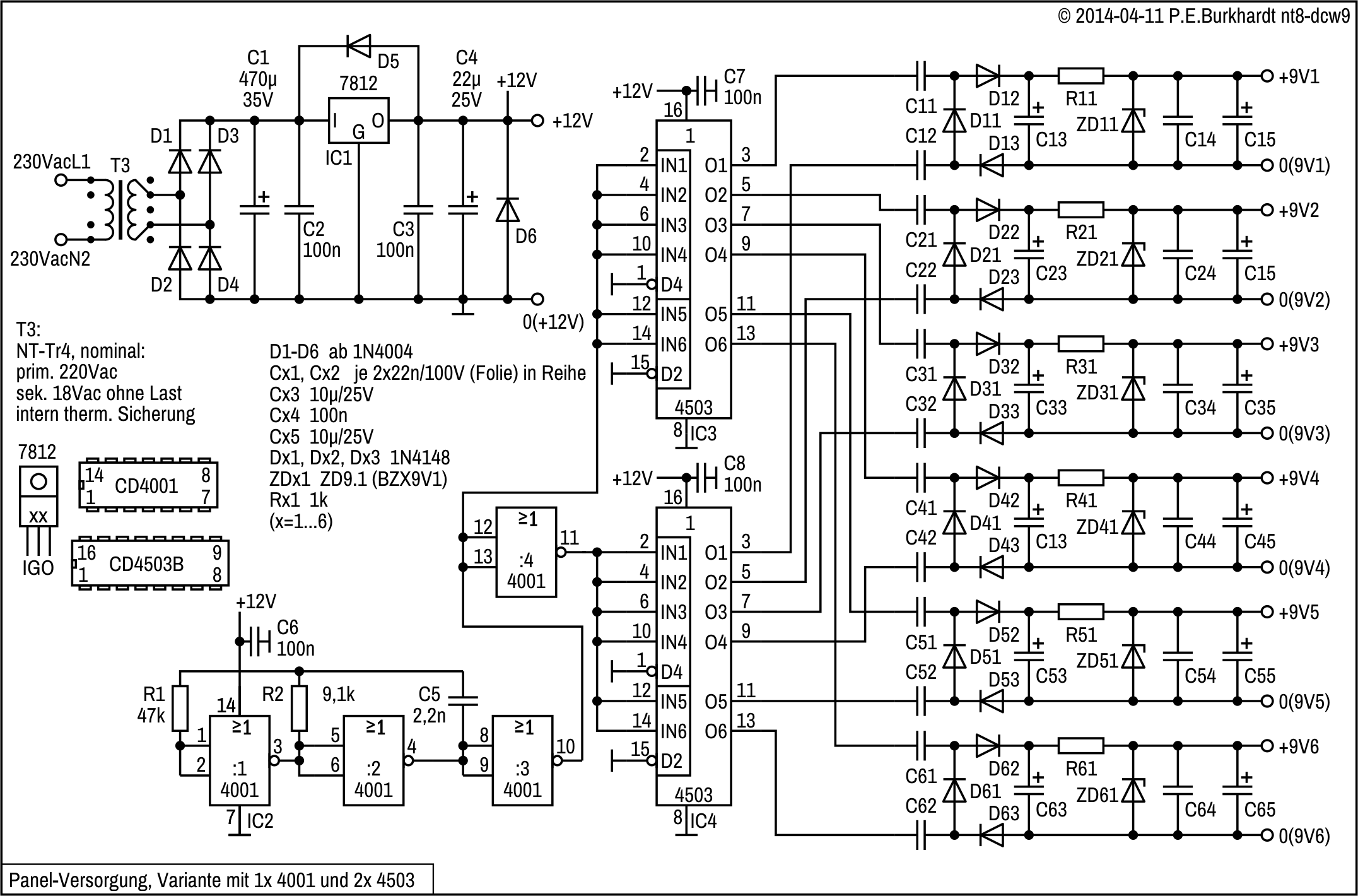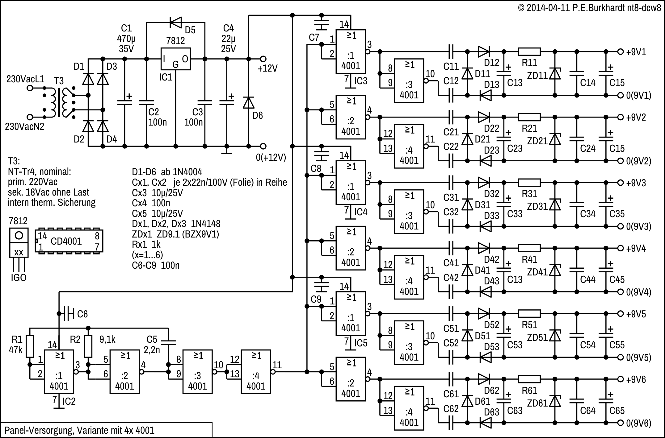 Die folgenden Schaltungen ergaben sich bei der Entwicklung von Labor-Netzteilen. Die Panel-Versorgungen sind netzgespeist. Basis ist eine Gleichspannung, aus der jeweils potentialfrei 4x 9 V (oder auch 6x 9 V) gewonnen werden.