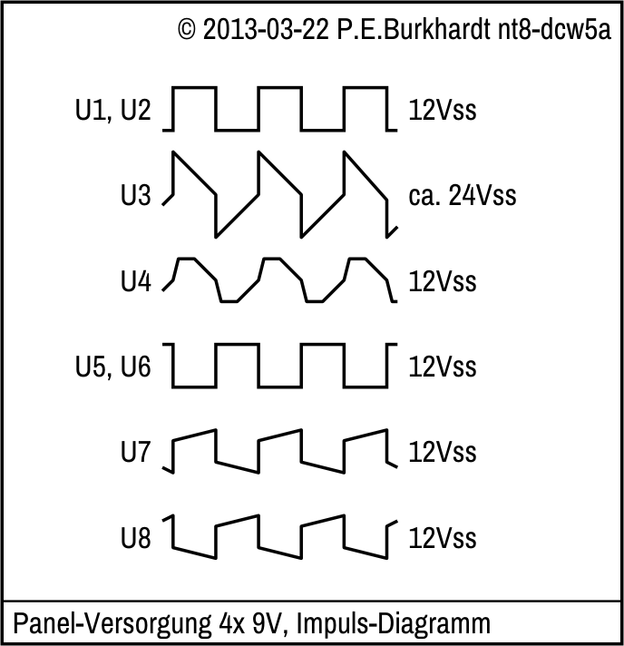 Die sich ergebenden Kurvenverläufe wurden an einigen Punkten der Schaltung aufgenommen, das Bild zeigt idealisiert die Impulse. U7 und U8 gelten auch für die anderen 3 Wandlerschaltungen.