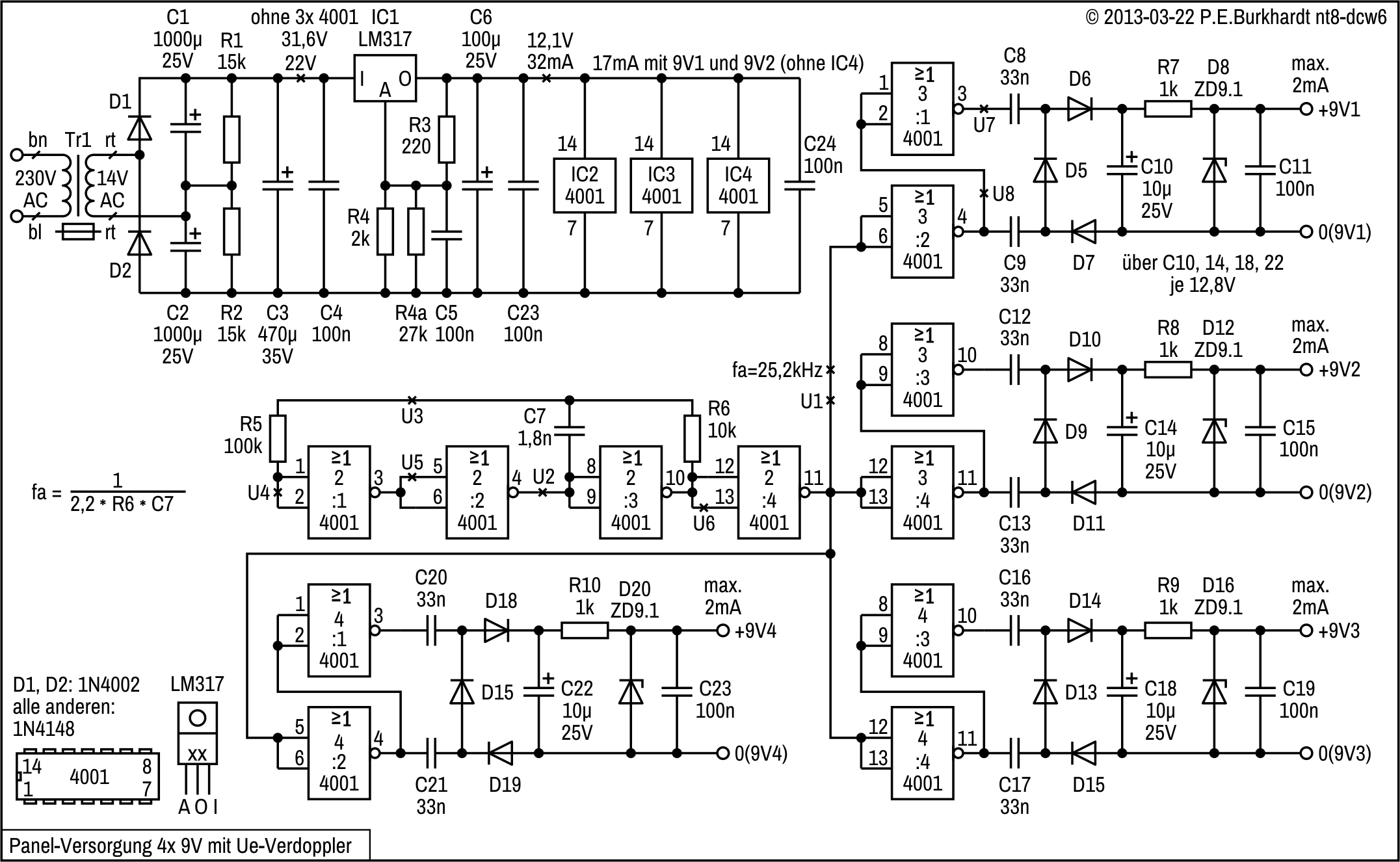 Die folgende 4-fach-Panel-Versorgung unterscheidet sich zur vorigen nur durch eine zusätzliche Spannungsverdopplung der Trafo-Spannung, um mit dem zur Verfügung stehenden Netztrafo auch bei Netzunterspannung die volle Belastbarkeit aller 4 Ausgänge zu gewährleisten. Oszillator und Wandler sind identisch zur Schaltung ohne Ue-Verdoppler und basieren auf der weiter oben beschriebenen Grundschaltung.