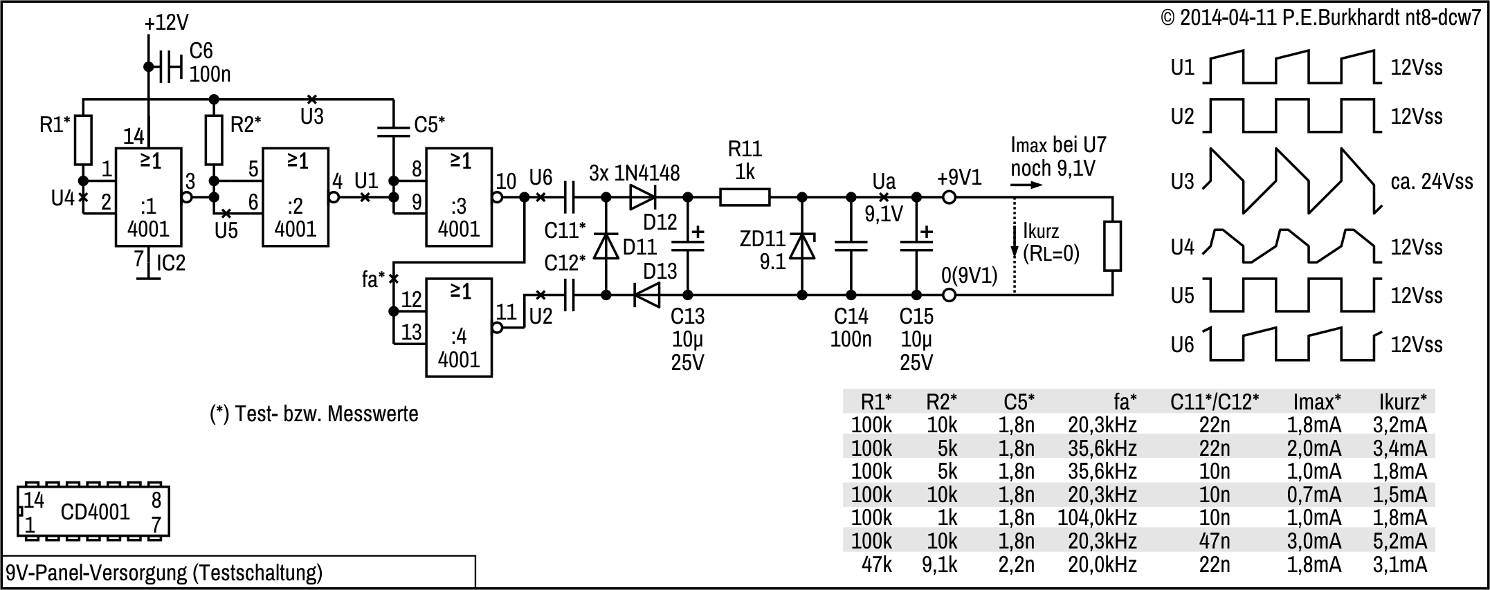 Um festzustellen, wie sich die Frequenz und die Größe der Koppel-Kondensatoren (C11, C12) auf die Belastungsfähigkeit der erzeugten 9 V auswirken, wurden verschiedene Bauelementewerte probiert. Die Tabelle im Bild zeigt, dass für die vorgesehene Speisung der PM438-Panels die letzte Zeile (mit R1 = 47 kΩ) günstig erscheint. Der Kurzschluss-Strom beträgt 3,1 mA. Das Panel benötigt aber nur etwa 1 mA. Es ist also genügend Spielraum vorhanden, damit die Z-Dioden-Stabilisierung funktioniert.